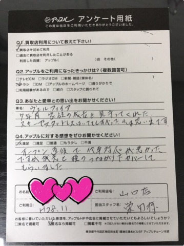 お車のご相談・ 査定だけでもOK! カンタン 入力 30秒 アップルがブランド買取始めました! お電話でも受付中! 受付時間10:00 ~ 19:00 0120-944-252 お車のご相談・ 査定だけでもOK! カンタン 入力 30秒 アップルがブランド買取始めました! お電話でも受付中! 受付時間10:00 ~ 19:00 0120-944-252 アップルがブランド買取始めました! お電話でも受付中! 受付時間10:00 ~ 19:00 0120-944-252 店舗情報 在庫車 スタッフ紹介 ブログ お客様の声 キャンペーン 無料査定 click お客様の声 ご記入日: 2016/11/30 A様 A様 アンケートのご協力ありがとうございました(^^)/ 前へ 次へ お客様の声一覧を見る