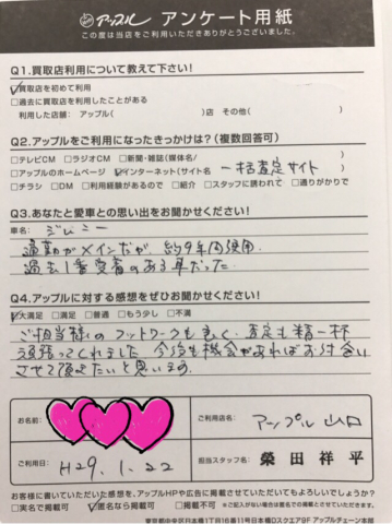 お車のご相談・ 査定だけでもOK! カンタン 入力 30秒 アップルがブランド買取始めました! お電話でも受付中! 受付時間10:00 ~ 19:00 0120-944-252 お車のご相談・ 査定だけでもOK! カンタン 入力 30秒 アップルがブランド買取始めました! お電話でも受付中! 受付時間10:00 ~ 19:00 0120-944-252 アップルがブランド買取始めました! お電話でも受付中! 受付時間10:00 ~ 19:00 0120-944-252 店舗情報 在庫車 スタッフ紹介 ブログ お客様の声 キャンペーン 無料査定 click お客様の声 ご記入日: 2017/01/22 T様 T様 アンケートのご協力ありがとうございました(^^)/ 前へ 次へ お客様の声一覧を見る