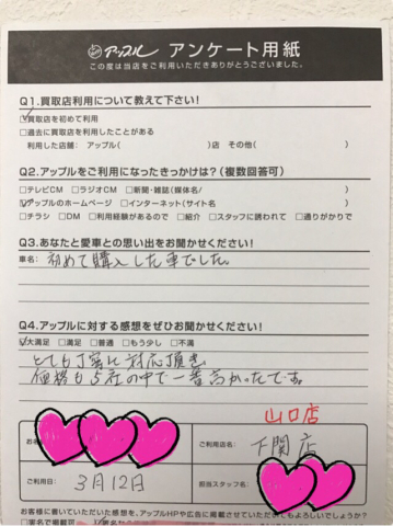 お車のご相談・ 査定だけでもOK! カンタン 入力 30秒 アップルがブランド買取始めました! お電話でも受付中! 受付時間10:00 ~ 19:00 0120-944-252 お車のご相談・ 査定だけでもOK! カンタン 入力 30秒 アップルがブランド買取始めました! お電話でも受付中! 受付時間10:00 ~ 19:00 0120-944-252 アップルがブランド買取始めました! お電話でも受付中! 受付時間10:00 ~ 19:00 0120-944-252 店舗情報 在庫車 スタッフ紹介 ブログ お客様の声 キャンペーン 無料査定 click お客様の声 ご記入日: 2017/02/10 W様 W様 アンケートのご協力ありがとうございました(^^)/ 前へ 次へ お客様の声一覧を見る