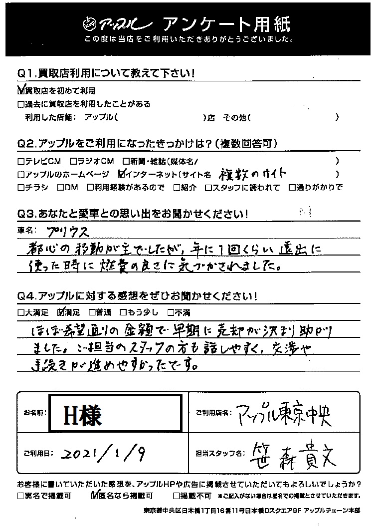 H様 車名:トヨタ プリウス(2023年3月~のPHVを含む)