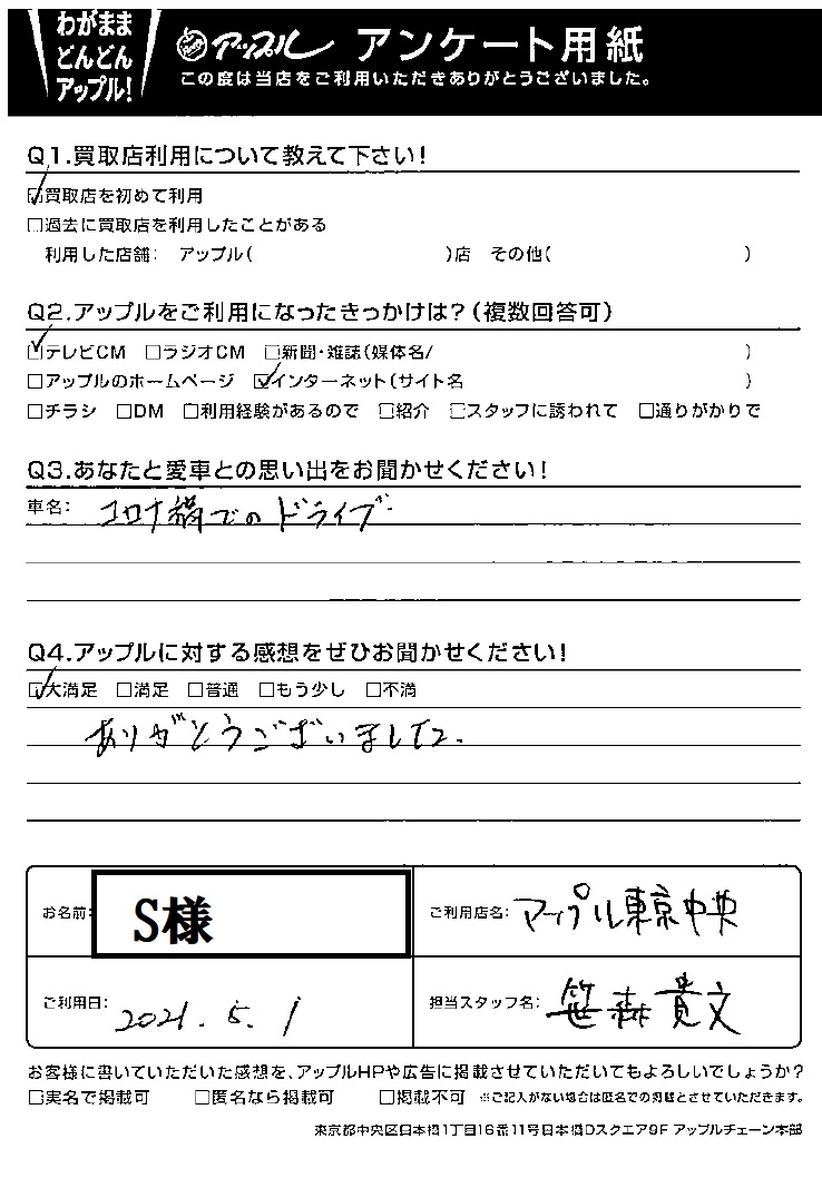 お車のご相談・ 査定だけでもOK! カンタン 入力 30秒 アップルがブランド買取始めました! お電話でも受付中! 受付時間10:00 ~ 19:00 03-6402-3700 お車のご相談・ 査定だけでもOK! カンタン 入力 30秒 アップルがブランド買取始めました! お電話でも受付中! 受付時間10:00 ~ 19:00 03-6402-3700 アップルがブランド買取始めました! お電話でも受付中! 受付時間10:00 ~ 19:00 03-6402-3700 店舗情報 在庫車 スタッフ紹介 ブログ お客様の声 キャンペーン 無料査定 click お客様の声 ご記入日: 2021/05/01 S様 Q:あなたと愛車との思い出をお聞かせください!コロナ過でのドライブ。Q:アップルに対する感想をぜひお聞かせください!大満足ありがとうございました。 前へ 次へ お客様の声一覧を見る