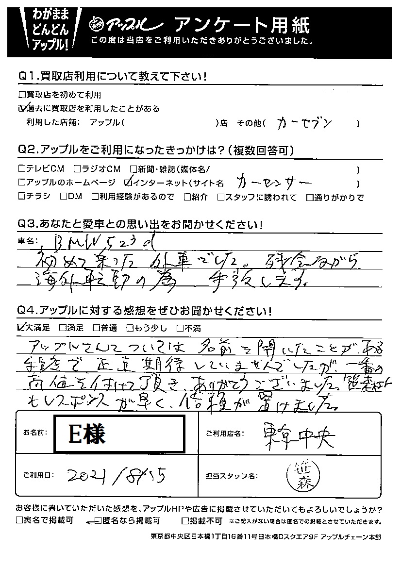 アップルさんについては名前を聞いたことがある程度で正直期待していませんでしたが、一番の高値を付けて頂き、ありがとうございました。笹森さんもレスポンスが早く、信頼が置けました。