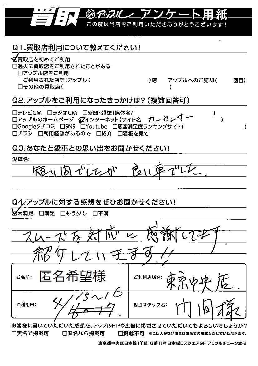 お車のご相談・ 査定だけでもOK! カンタン 入力 30秒 アップルがブランド買取始めました! お電話でも受付中! 受付時間10:00 ~ 19:00 03-6402-3700 お車のご相談・ 査定だけでもOK! カンタン 入力 30秒 アップルがブランド買取始めました! お電話でも受付中! 受付時間10:00 ~ 19:00 03-6402-3700 アップルがブランド買取始めました! お電話でも受付中! 受付時間10:00 ~ 19:00 03-6402-3700 店舗情報 在庫車 スタッフ紹介 ブログ お客様の声 キャンペーン 無料査定 click お客様の声 ご記入日: 2022/04/15 匿名希望様 Q あなたと愛車の思い出をお聞かせください車名:短い間でしたが良い車でしたQ アップルに対する感想をぜひお聞かせください感想:大満足スムーズな対応に感謝してます。紹介していきます!! 前へ 次へ お客様の声一覧を見る