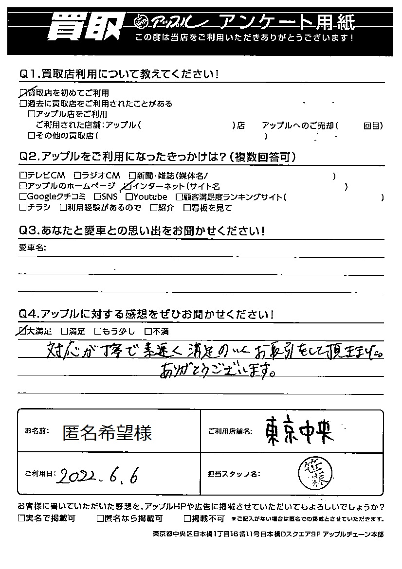 お車のご相談・ 査定だけでもOK! カンタン 入力 30秒 アップルがブランド買取始めました! お電話でも受付中! 受付時間10:00 ~ 19:00 03-6402-3700 お車のご相談・ 査定だけでもOK! カンタン 入力 30秒 アップルがブランド買取始めました! お電話でも受付中! 受付時間10:00 ~ 19:00 03-6402-3700 アップルがブランド買取始めました! お電話でも受付中! 受付時間10:00 ~ 19:00 03-6402-3700 店舗情報 在庫車 スタッフ紹介 ブログ お客様の声 キャンペーン 無料査定 click お客様の声 ご記入日: 2022/06/06 匿名希望様様 Q あなたと愛車の思い出をお聞かせください車名:Q アップルに対する感想をぜひお聞かせください感想:大満足対応が丁寧で素早く満足のいくお取引をして頂きました。ありがとうございます。 前へ 次へ お客様の声一覧を見る