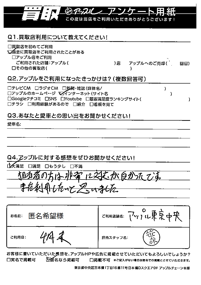 お車のご相談・ 査定だけでもOK! カンタン 入力 30秒 アップルがブランド買取始めました! お電話でも受付中! 受付時間10:00 ~ 19:00 03-6402-3700 お車のご相談・ 査定だけでもOK! カンタン 入力 30秒 アップルがブランド買取始めました! お電話でも受付中! 受付時間10:00 ~ 19:00 03-6402-3700 アップルがブランド買取始めました! お電話でも受付中! 受付時間10:00 ~ 19:00 03-6402-3700 店舗情報 在庫車 スタッフ紹介 ブログ お客様の声 キャンペーン 無料査定 click お客様の声 ご記入日: 2022/04/30 匿名希望様様 Q あなたと愛車の思い出をお聞かせください車名:Q アップルに対する感想をぜひお聞かせください感想:大満足担当者の方は非常に対応が良かったです。また利用したいと思いました。 前へ 次へ お客様の声一覧を見る
