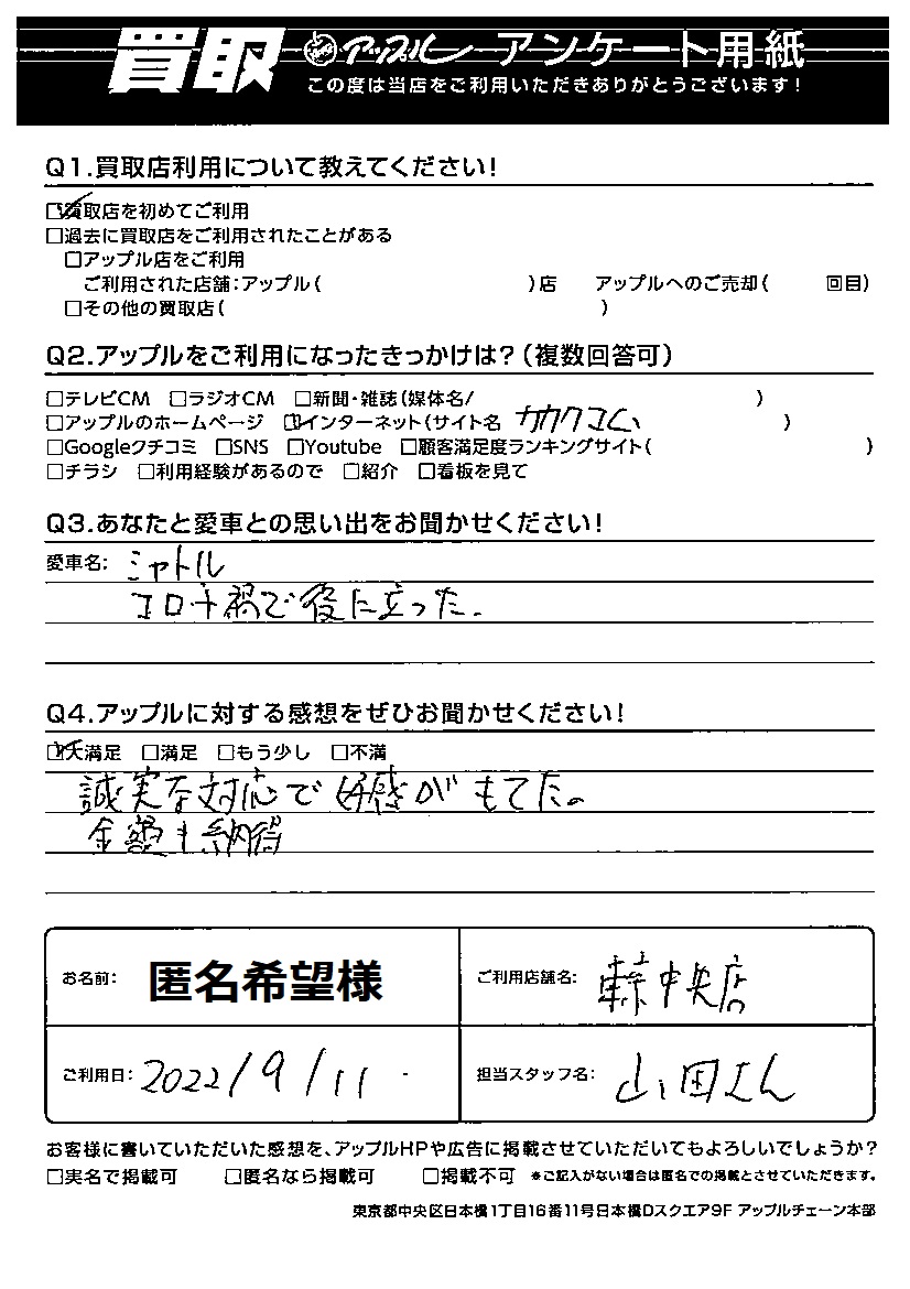お車のご相談・ 査定だけでもOK! カンタン 入力 30秒 アップルがブランド買取始めました! お電話でも受付中! 受付時間10:00 ~ 19:00 03-6402-3700 お車のご相談・ 査定だけでもOK! カンタン 入力 30秒 アップルがブランド買取始めました! お電話でも受付中! 受付時間10:00 ~ 19:00 03-6402-3700 アップルがブランド買取始めました! お電話でも受付中! 受付時間10:00 ~ 19:00 03-6402-3700 店舗情報 在庫車 スタッフ紹介 ブログ お客様の声 キャンペーン 無料査定 click お客様の声 ご記入日: 2022/09/11 匿名希望様 車名:ホンダ シャトル Q あなたと愛車の思い出をお聞かせください車名:シャトルコロナ禍で役に立った。Q アップルに対する感想をぜひお聞かせください感想:大満足誠実な対応で好感がもてた。金額も納得。 前へ 次へ お客様の声一覧を見る