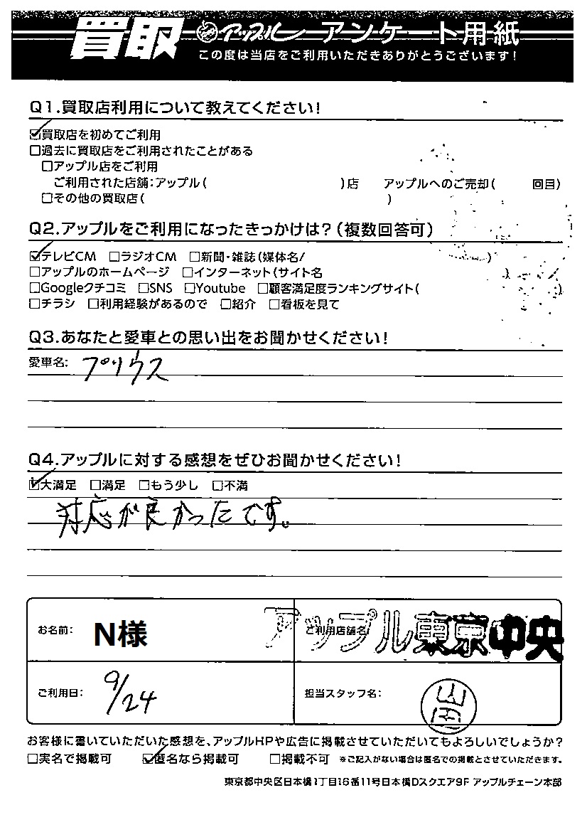 お車のご相談・ 査定だけでもOK! カンタン 入力 30秒 アップルがブランド買取始めました! お電話でも受付中! 受付時間10:00 ~ 19:00 03-6402-3700 お車のご相談・ 査定だけでもOK! カンタン 入力 30秒 アップルがブランド買取始めました! お電話でも受付中! 受付時間10:00 ~ 19:00 03-6402-3700 アップルがブランド買取始めました! お電話でも受付中! 受付時間10:00 ~ 19:00 03-6402-3700 店舗情報 在庫車 スタッフ紹介 ブログ お客様の声 キャンペーン 無料査定 click お客様の声 ご記入日: 2022/09/24 匿名希望様 車名:トヨタ プリウス(2023年3月~のPHVを含む) Q あなたと愛車の思い出をお聞かせください車名:プリウスQ アップルに対する感想をぜひお聞かせください感想:大満足対応が良かったです。 前へ 次へ お客様の声一覧を見る