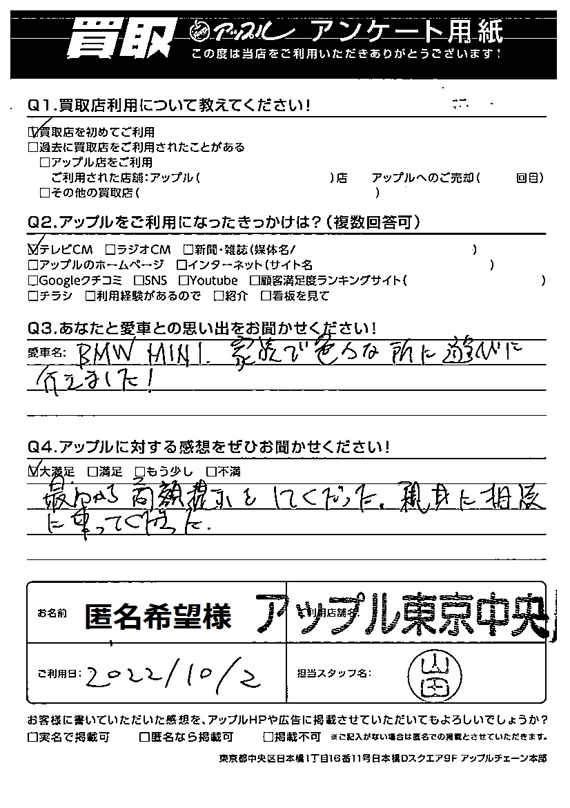 最初から高額提示をしてくださった。親身に相談に乗ってくださった。