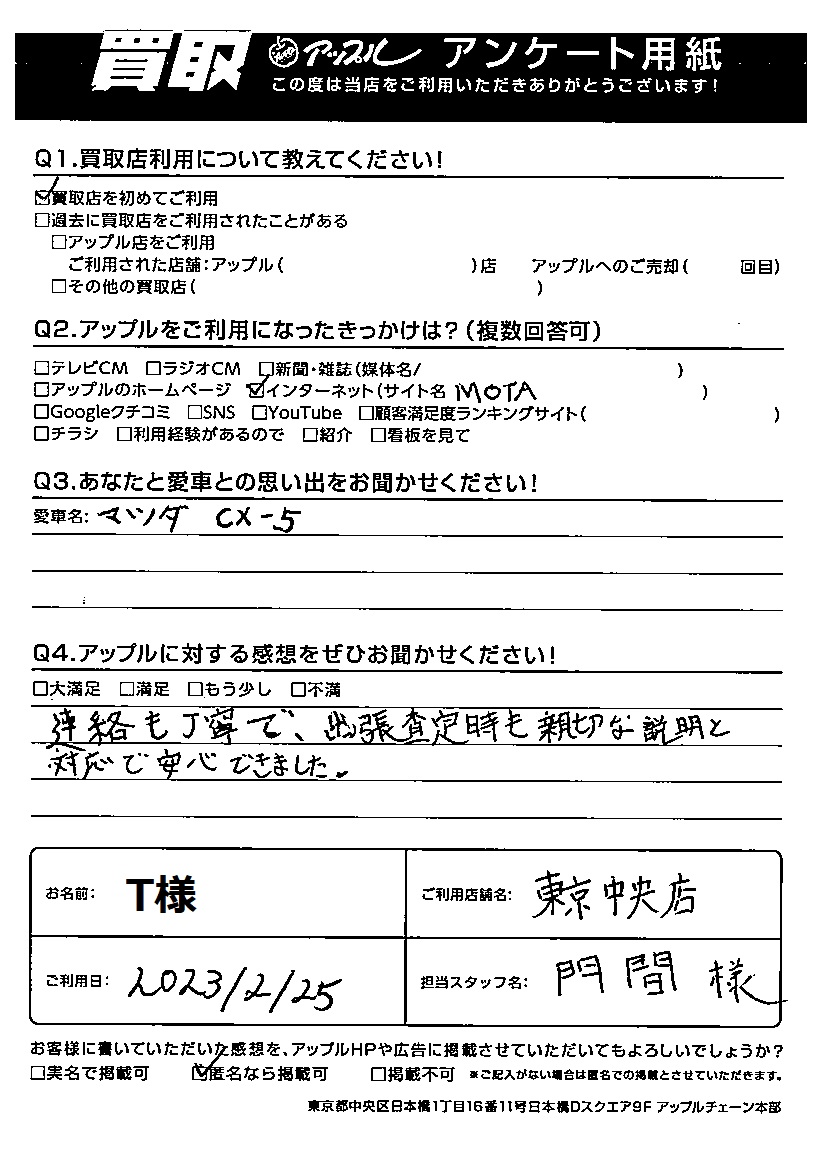 お車のご相談・ 査定だけでもOK! カンタン 入力 30秒 アップルがブランド買取始めました! お電話でも受付中! 受付時間10:00 ~ 19:00 03-6402-3700 お車のご相談・ 査定だけでもOK! カンタン 入力 30秒 アップルがブランド買取始めました! お電話でも受付中! 受付時間10:00 ~ 19:00 03-6402-3700 アップルがブランド買取始めました! お電話でも受付中! 受付時間10:00 ~ 19:00 03-6402-3700 店舗情報 在庫車 スタッフ紹介 ブログ お客様の声 キャンペーン 無料査定 click お客様の声 ご記入日: 2023/02/25 T様 車名:マツダ CX-5 Q あなたと愛車の思い出をお聞かせください車名:マツダ CX-5Q アップルに対する感想をぜひお聞かせください感想:連絡も丁寧で、出張査定時も親切な説明と対応で安心できました。 前へ 次へ お客様の声一覧を見る