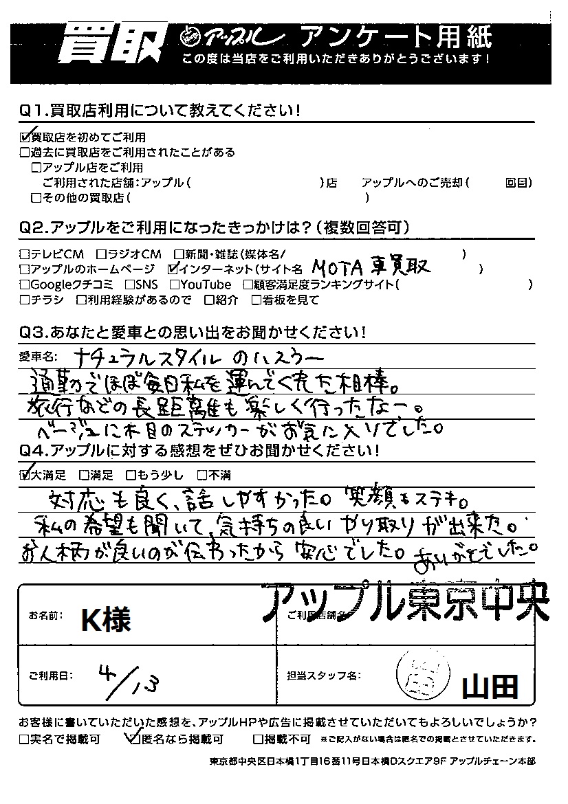 対応も良く、話しやすかった。笑顔もステキ。私の希望も聞いて、気持ちの良いやり取りが出来た。お人柄が良いのが伝わったから安心でした。ありがとでした。