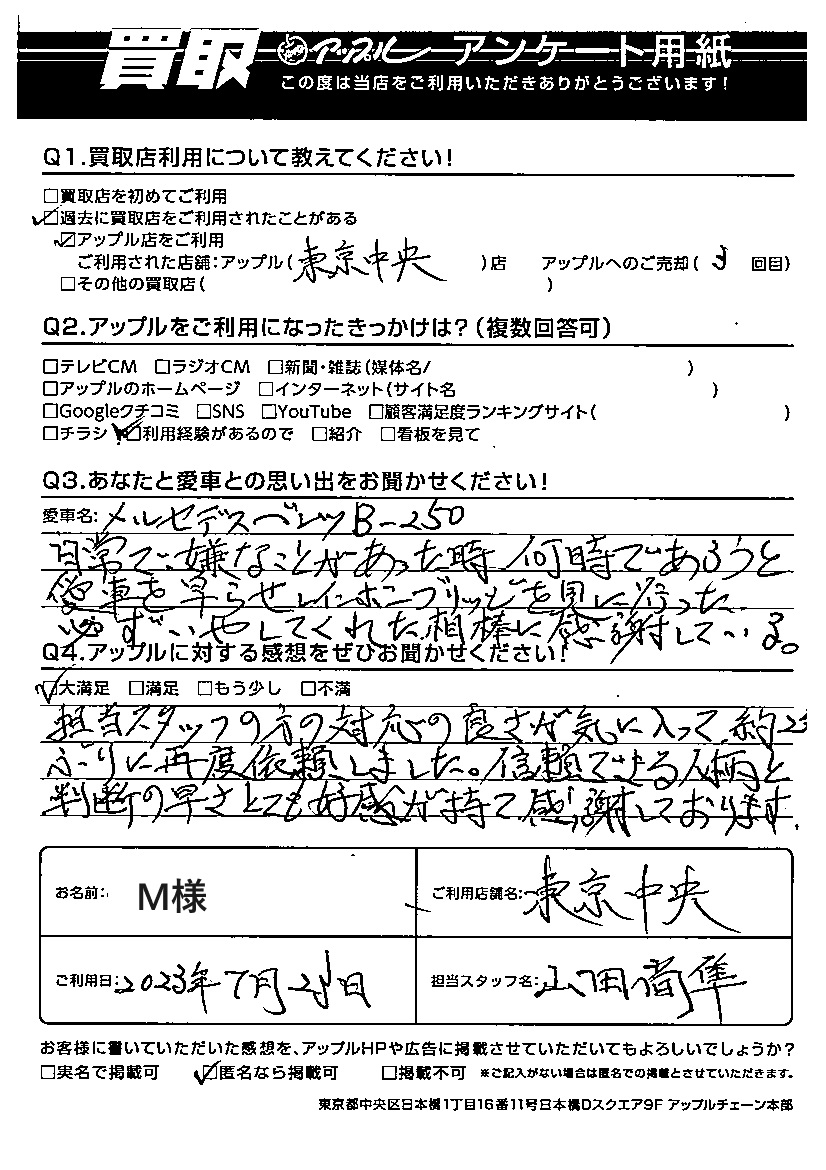 担当スタッフの方の対応の良さが気に入って、約2年ぶりに再度依頼しました。信頼できる人柄と判断の早さとても好感が持て、感謝しております。