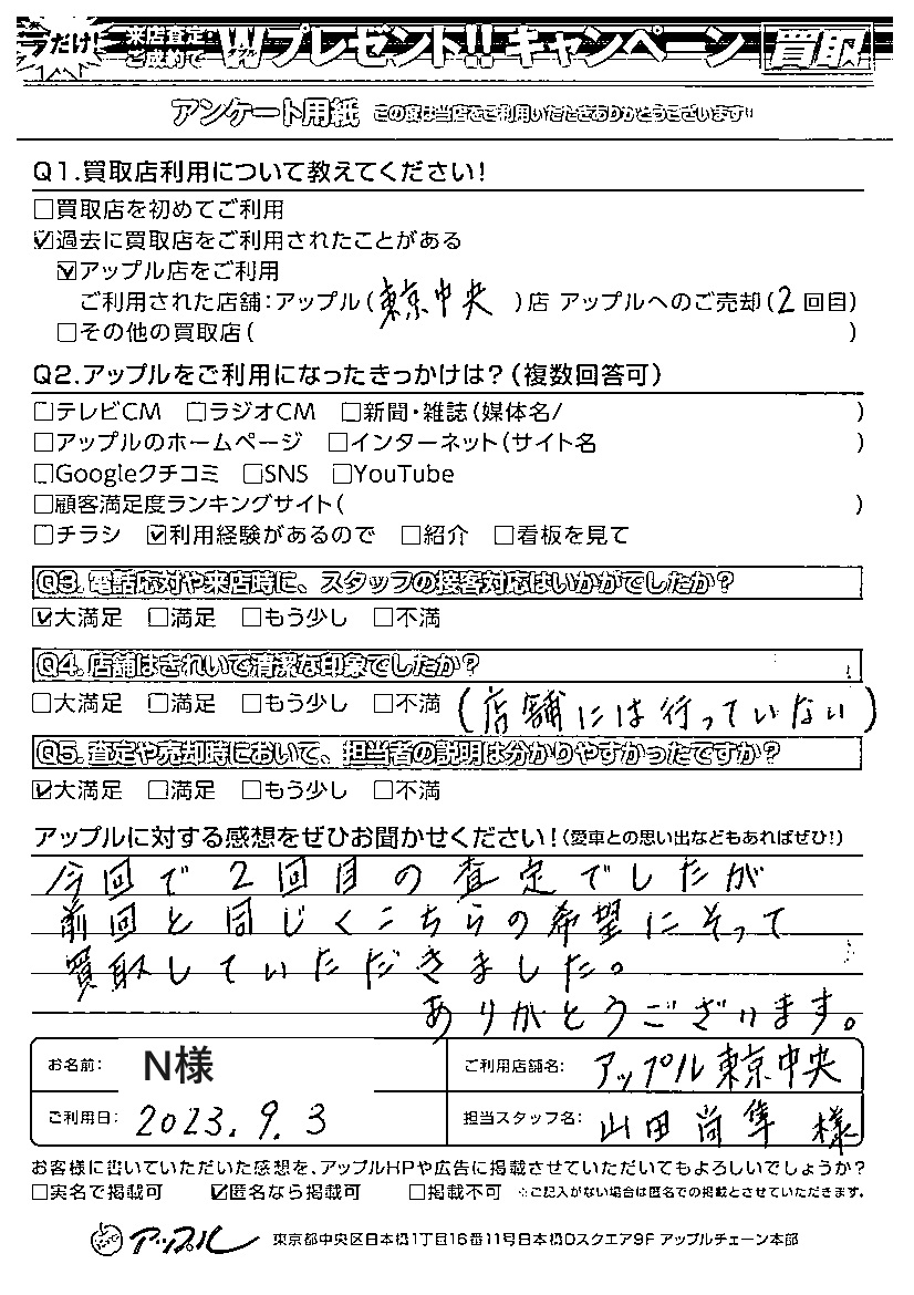 今回で2回目の査定でしたが、前回と同じくこちらの希望にそって買取していただきました。ありがとうございます。