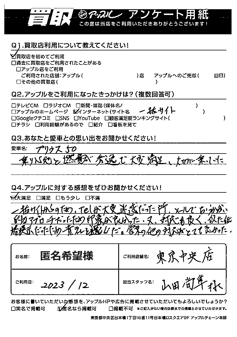 匿名希望様 車名:トヨタ プリウスPHV(2023年3月~のPHV含まず)