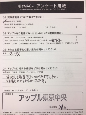 お車のご相談・ 査定だけでもOK! カンタン 入力 30秒 アップルがブランド買取始めました! お電話でも受付中! 受付時間10:00 ~ 19:00 03-6402-3700 お車のご相談・ 査定だけでもOK! カンタン 入力 30秒 アップルがブランド買取始めました! お電話でも受付中! 受付時間10:00 ~ 19:00 03-6402-3700 アップルがブランド買取始めました! お電話でも受付中! 受付時間10:00 ~ 19:00 03-6402-3700 店舗情報 在庫車 スタッフ紹介 ブログ お客様の声 キャンペーン 無料査定 click お客様の声 ご記入日: 2017/03/22 中央区 S様 車名 マークX【アップルに対する感想をぜひお聞かせください!】安心して取引することができました。説明もわかりやすかったです。 前へ 次へ お客様の声一覧を見る