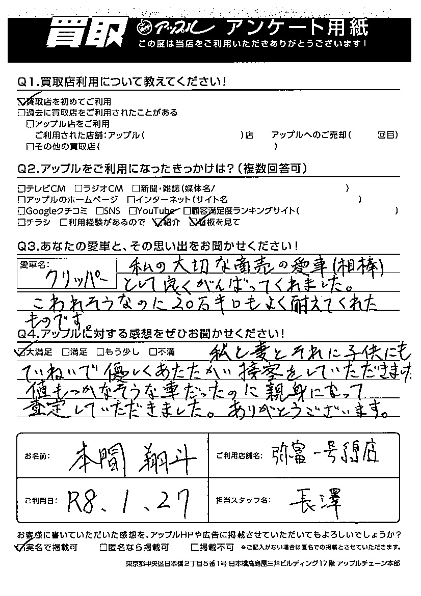 値もつかなそうな車だったのに親身になって査定していただきました。ありがとうございます。