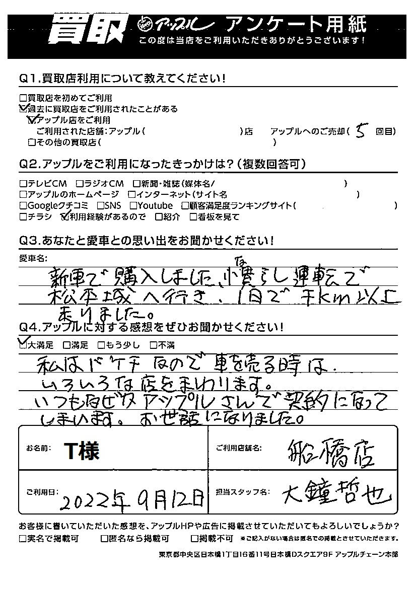 ご利用日:2022/9/12 T 様
