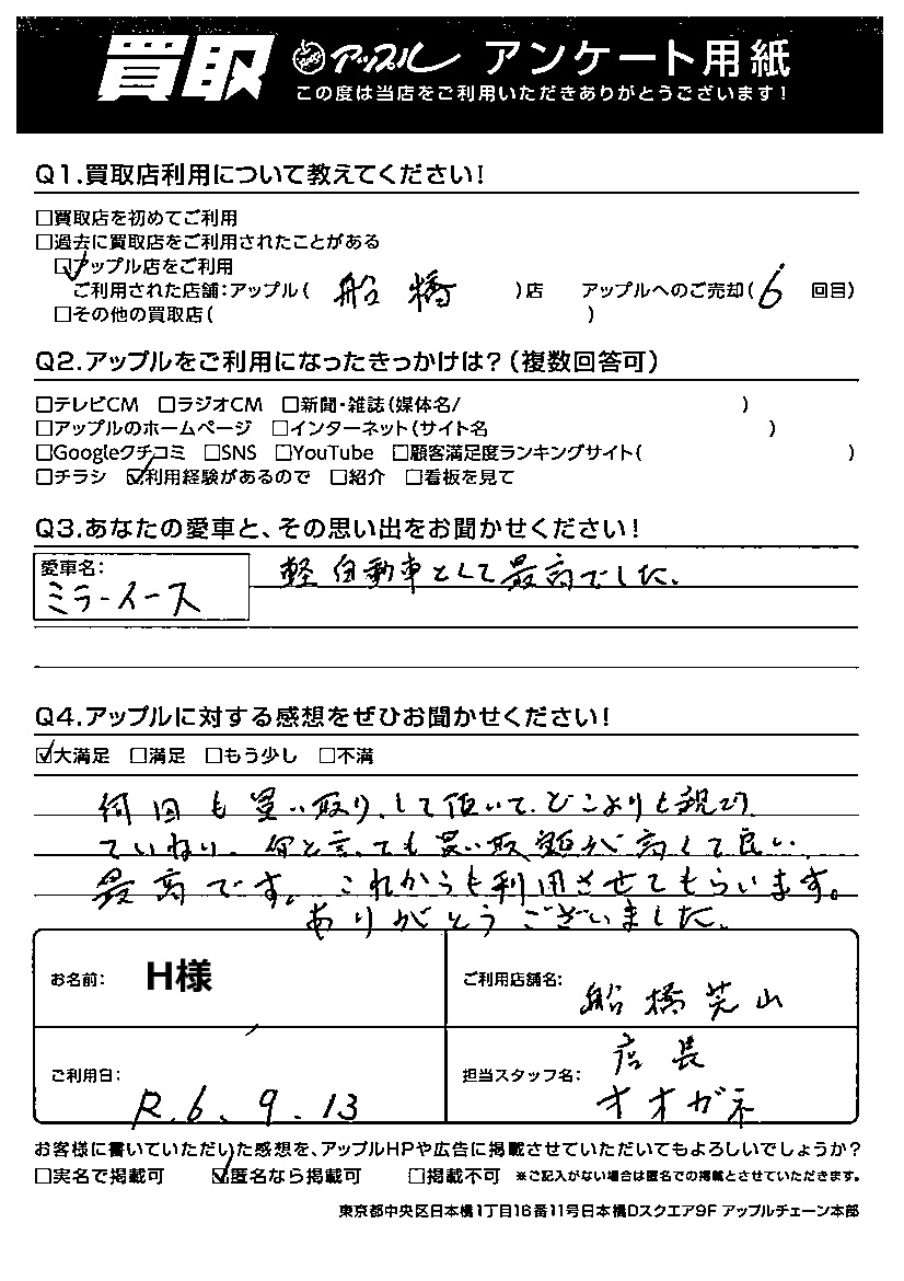 H様  車名:ダイハツ ミラ