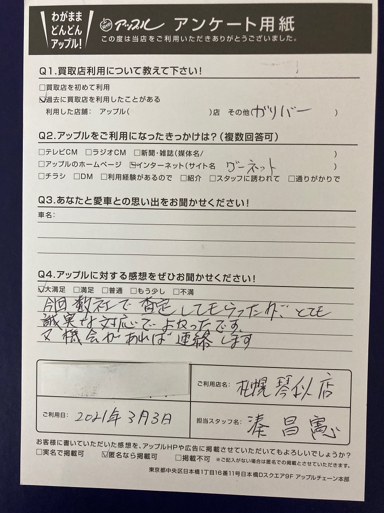 お車のご相談・ 査定だけでもOK! カンタン 入力 30秒 アップルがブランド買取始めました! お電話でも受付中! 受付時間10:00 ~ 18:00 0120-002-077 お車のご相談・ 査定だけでもOK! カンタン 入力 30秒 アップルがブランド買取始めました! お電話でも受付中! 受付時間10:00 ~ 18:00 0120-002-077 アップルがブランド買取始めました! お電話でも受付中! 受付時間10:00 ~ 18:00 0120-002-077 店舗情報 在庫車 スタッフ紹介 ブログ お客様の声 キャンペーン お得 無料査定 click お客様の声 ご記入日: 2021/03/03 札幌市西区 S様 車名:スズキ ワゴンR 〈アップルに対する感想をぜひお聞かせください!〉今回数社で査定してもらったが、とても誠実な対応でよかったです。又機会があれば連絡します。 前へ 次へ お客様の声一覧を見る