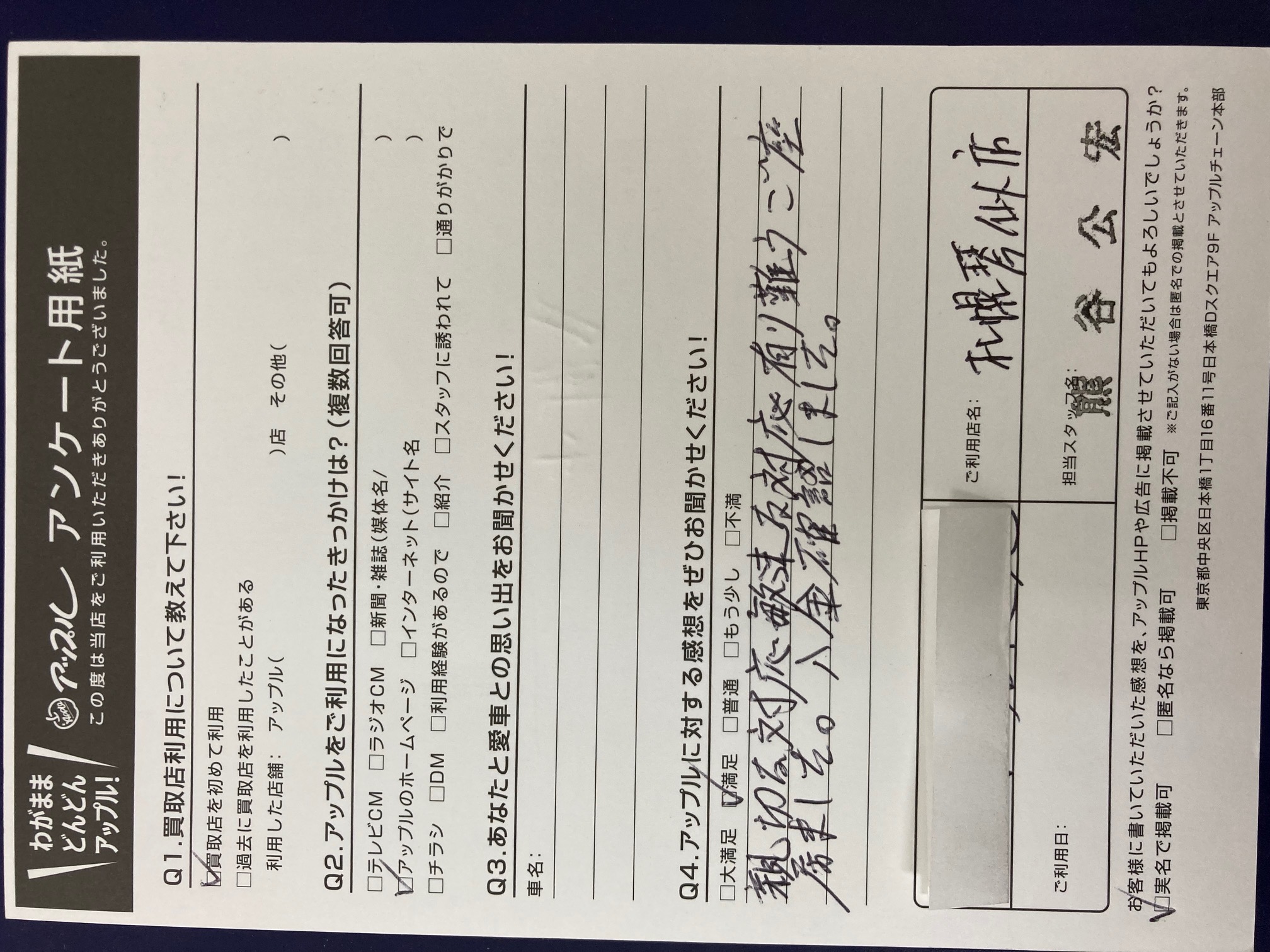 お車のご相談・ 査定だけでもOK! カンタン 入力 30秒 アップルがブランド買取始めました! お電話でも受付中! 受付時間10:00 ~ 18:00 0120-002-077 お車のご相談・ 査定だけでもOK! カンタン 入力 30秒 アップルがブランド買取始めました! お電話でも受付中! 受付時間10:00 ~ 18:00 0120-002-077 アップルがブランド買取始めました! お電話でも受付中! 受付時間10:00 ~ 18:00 0120-002-077 店舗情報 在庫車 スタッフ紹介 ブログ お客様の声 キャンペーン お得 無料査定 click お客様の声 ご記入日: 2021/05/19 西区 K様 車名:ダイハツ ミライース 〈アップルに対する感想をぜひお聞かせください!〉親切な対応敏速な対応有り難う御座いました。入金確認しました。 前へ 次へ お客様の声一覧を見る