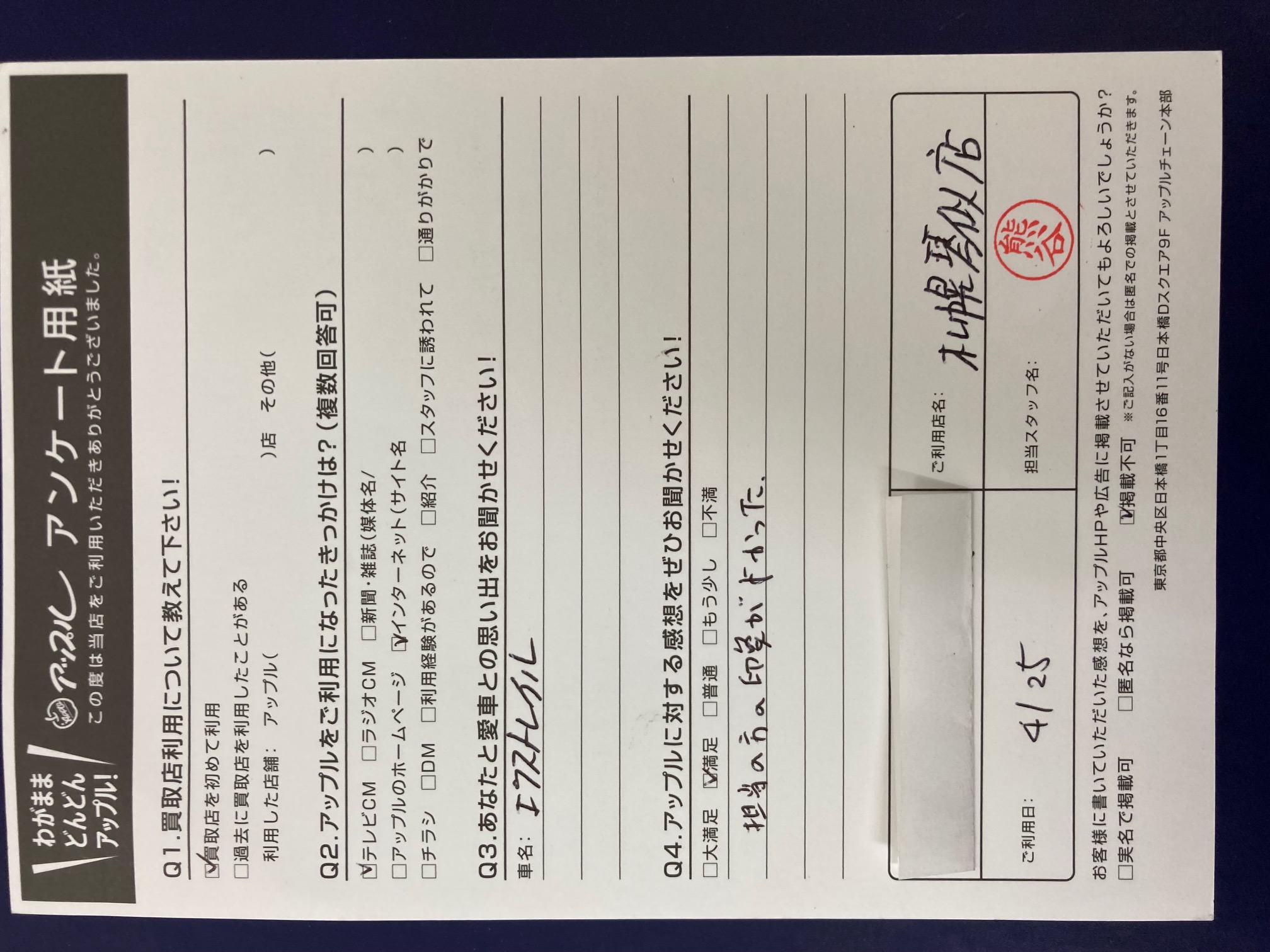 お車のご相談・ 査定だけでもOK! カンタン 入力 30秒 アップルがブランド買取始めました! お電話でも受付中! 受付時間10:00 ~ 18:00 0120-002-077 お車のご相談・ 査定だけでもOK! カンタン 入力 30秒 アップルがブランド買取始めました! お電話でも受付中! 受付時間10:00 ~ 18:00 0120-002-077 アップルがブランド買取始めました! お電話でも受付中! 受付時間10:00 ~ 18:00 0120-002-077 店舗情報 在庫車 スタッフ紹介 ブログ お客様の声 キャンペーン お得 無料査定 click お客様の声 ご記入日: 2021/04/25 中央区 O様 車名:日産 エクストレイル 〈アップルに対する感想をぜひお聞かせください!〉担当の方の印象が良かった。 前へ 次へ お客様の声一覧を見る