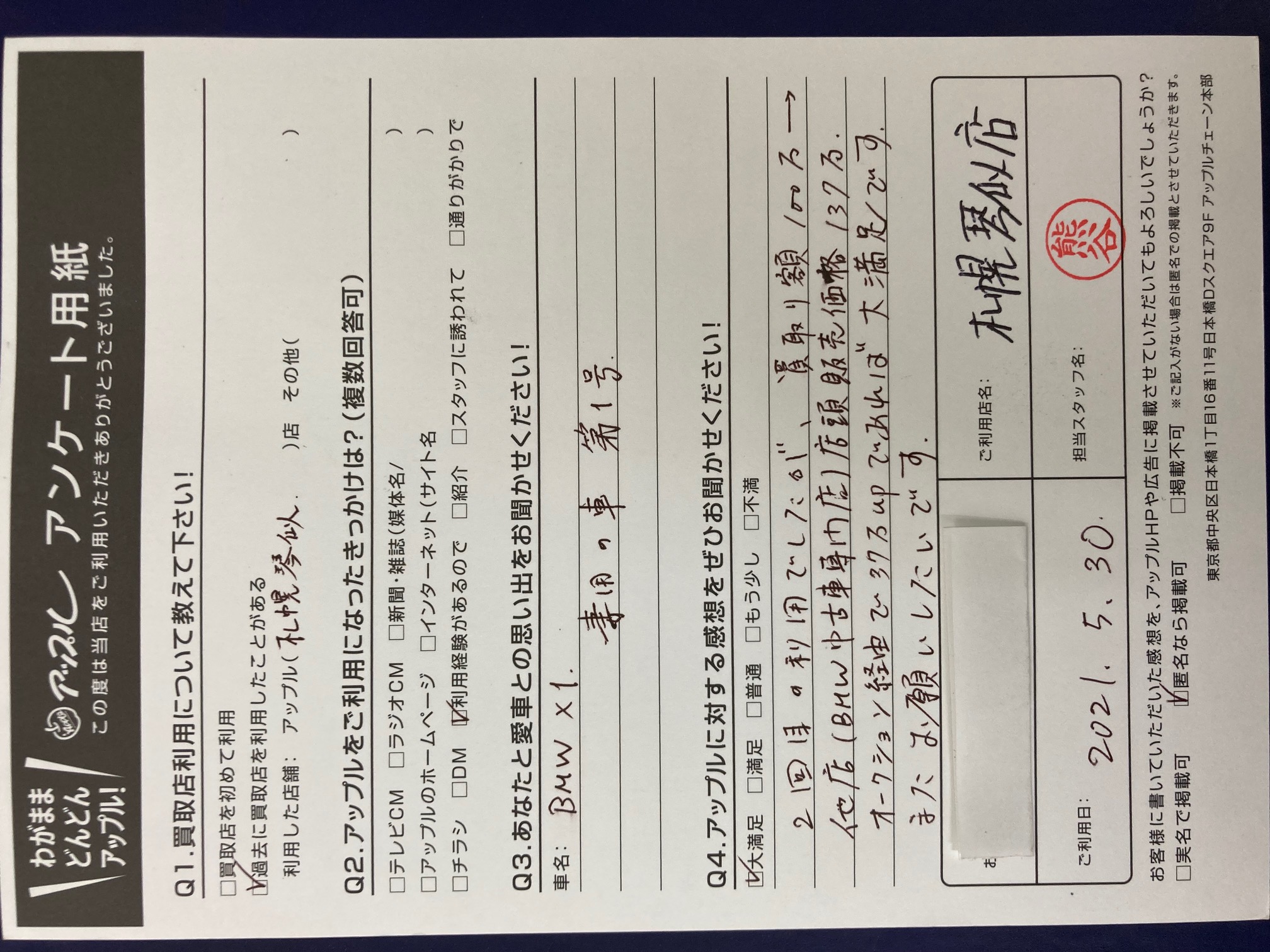 お車のご相談・ 査定だけでもOK! カンタン 入力 30秒 アップルがブランド買取始めました! お電話でも受付中! 受付時間10:00 ~ 18:00 0120-002-077 お車のご相談・ 査定だけでもOK! カンタン 入力 30秒 アップルがブランド買取始めました! お電話でも受付中! 受付時間10:00 ~ 18:00 0120-002-077 アップルがブランド買取始めました! お電話でも受付中! 受付時間10:00 ~ 18:00 0120-002-077 店舗情報 在庫車 スタッフ紹介 ブログ お客様の声 キャンペーン お得 無料査定 click お客様の声 ご記入日: 2021/05/30 中央区 H様 車名:BMW X1 〈あなたと愛車との思い出をお聞かせください!〉妻用の車 第1号〈アップルに対する感想をぜひお聞かせください!〉2回目の利用でしたが、買取り額100万→他社(BMW中古車専門店)店頭販売価格137万。オークション経由で37万円UPであれば大満足です。またお願いしたいです。 前へ 次へ お客様の声一覧を見る