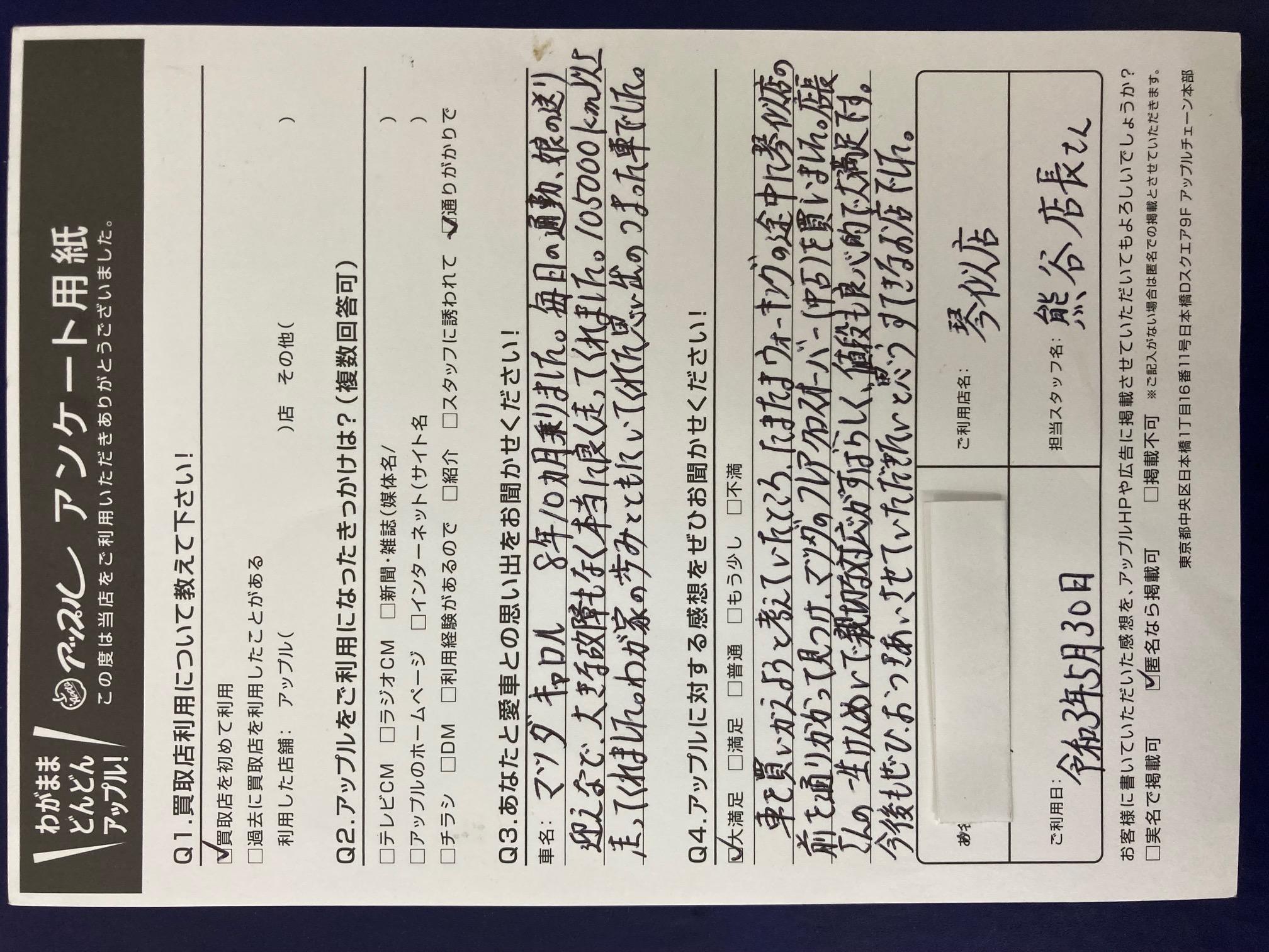車を買いかえようと考えていたところ、たまたまウォーキングの途中に琴似店の前を通りがかって見つけ、マツダのフレアクロスオーバー(中古)を買いました。店長さんの一生けんめいで親切な対応がすばらしく、値段も良心的で大満足です。今後もぜひおつきあいさせていただきたいと思う。すてきなお店でした。