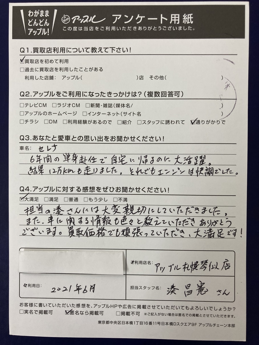 担当の湊さんには大変親切にしていただきました。また、車に関する情報も色々と教えていただきありがとうございます。買取価格でも頑張っていただき大満足です!