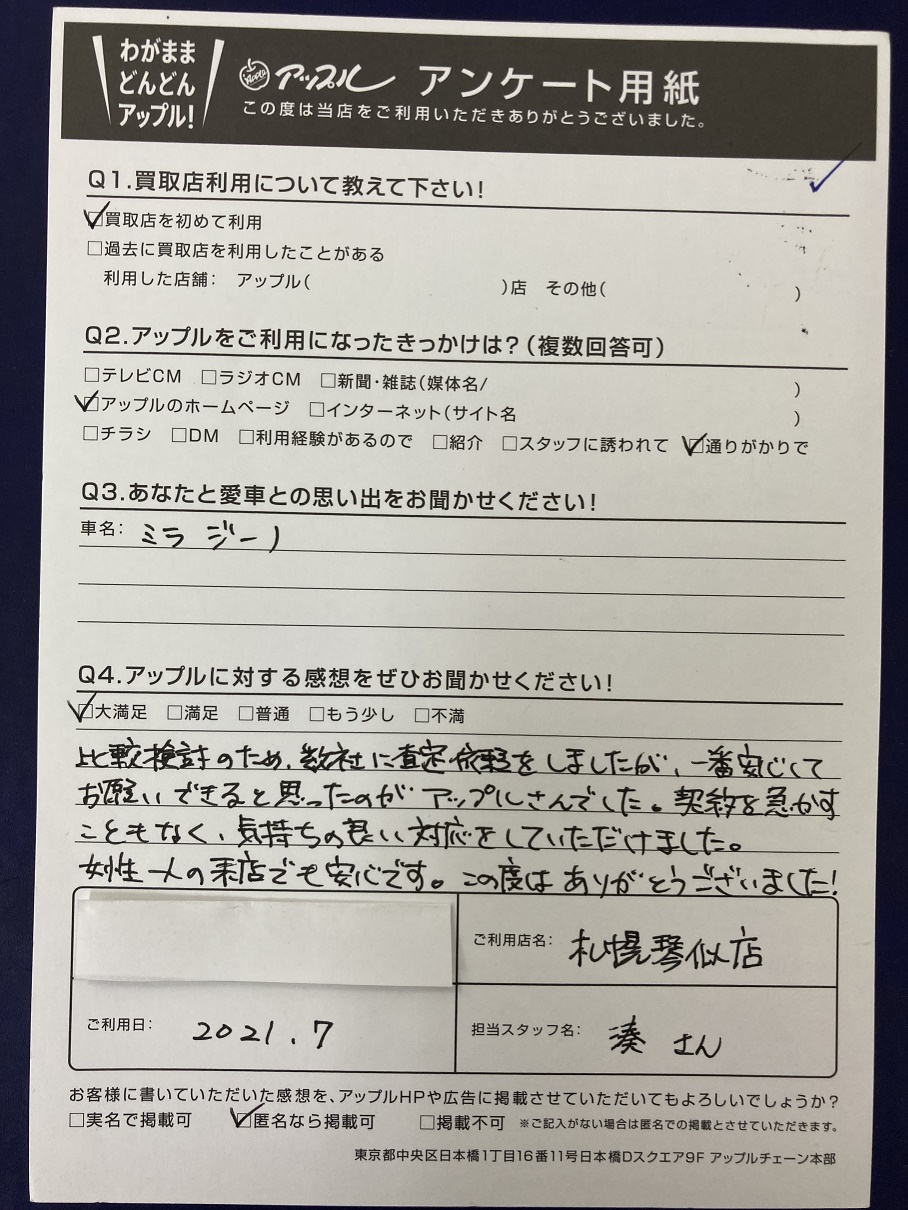 お車のご相談・ 査定だけでもOK! カンタン 入力 30秒 アップルがブランド買取始めました! お電話でも受付中! 受付時間10:00 ~ 18:00 0120-002-077 お車のご相談・ 査定だけでもOK! カンタン 入力 30秒 アップルがブランド買取始めました! お電話でも受付中! 受付時間10:00 ~ 18:00 0120-002-077 アップルがブランド買取始めました! お電話でも受付中! 受付時間10:00 ~ 18:00 0120-002-077 店舗情報 在庫車 スタッフ紹介 ブログ お客様の声 キャンペーン お得 無料査定 click お客様の声 ご記入日: 2021/07/04 札幌市西区 T様 車名:ダイハツ ミラジーノ 〈アップルに対する感想をぜひお聞かせください!〉比較検討のため、数社に査定を依頼しましたが、一番安心してお願いできると思ったのがアップルさんでした。契約を急かすこともなく、気持ちの良い対応をしていただけました。女性一人の来店でも安心です。この度はありがとうございました! 前へ 次へ お客様の声一覧を見る