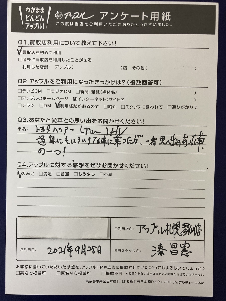 札幌市中央区 O様  車名:トヨタ ハリアーハイブリッド (~H25年7月)