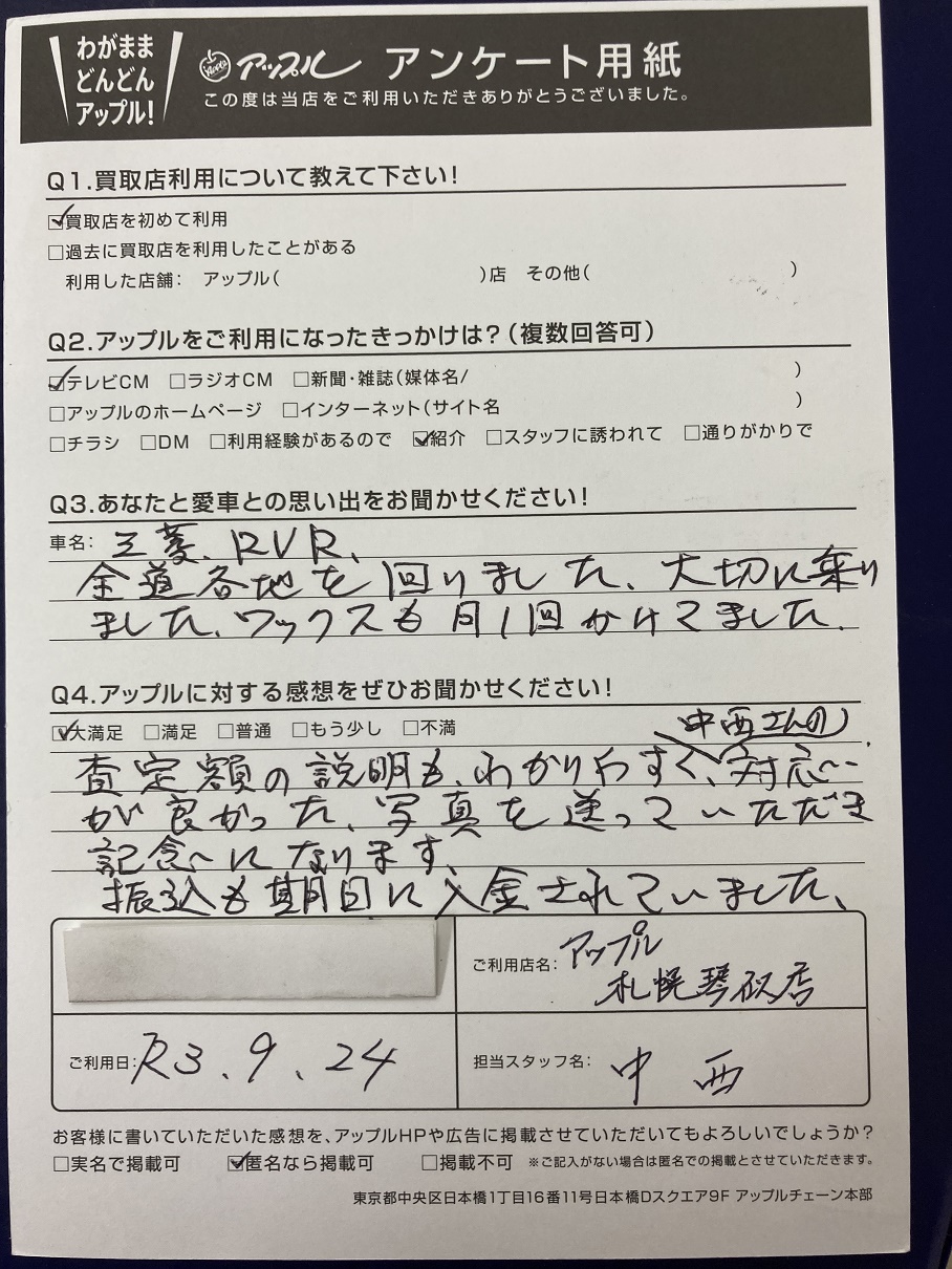 査定額の説明もわかりやすく、中西さんの対応が良かった、写真を送っていただき記念になります。振り込みも期日に入金されていました。