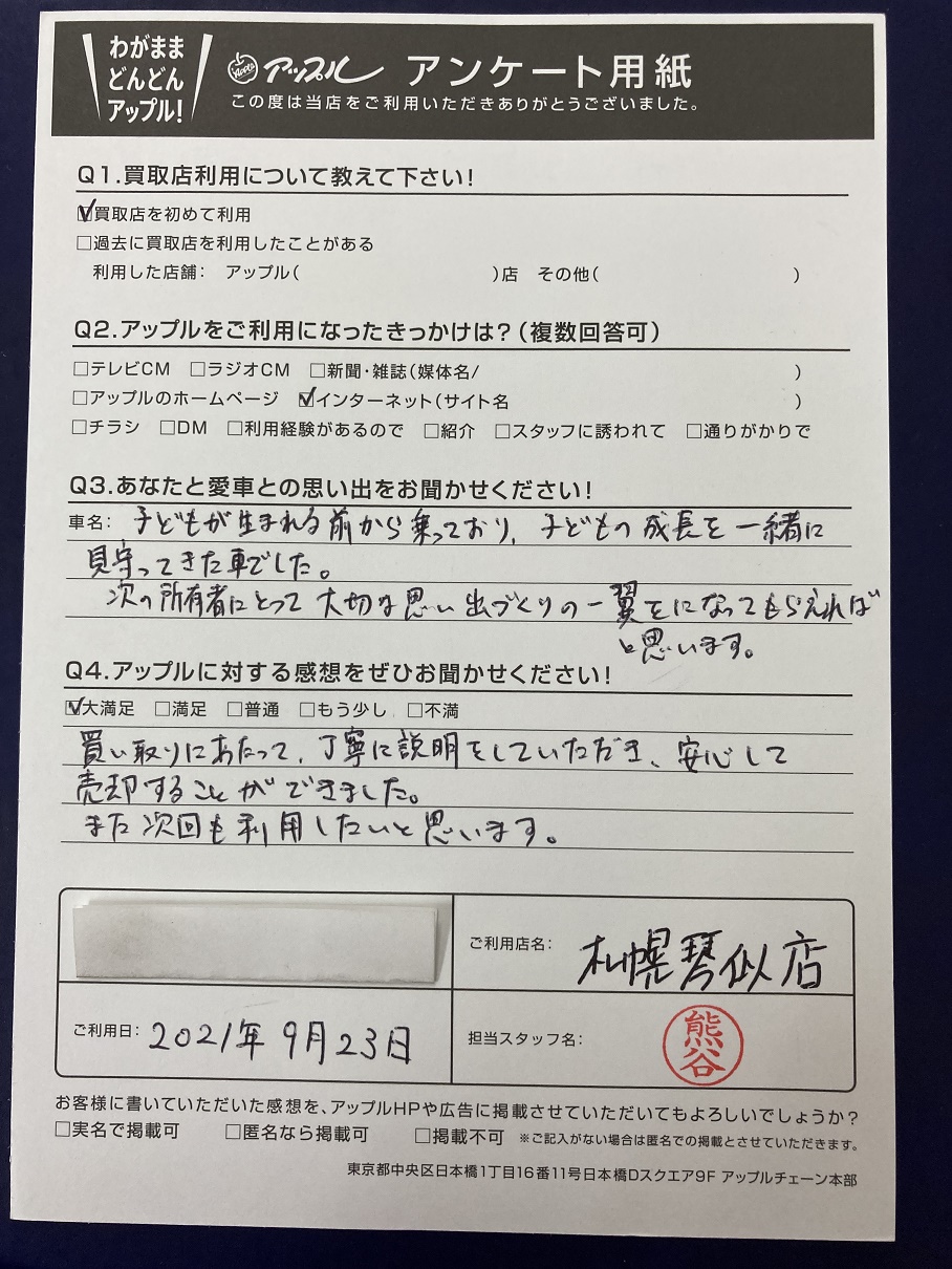 お車のご相談・ 査定だけでもOK! カンタン 入力 30秒 アップルがブランド買取始めました! お電話でも受付中! 受付時間10:00 ~ 18:00 0120-002-077 お車のご相談・ 査定だけでもOK! カンタン 入力 30秒 アップルがブランド買取始めました! お電話でも受付中! 受付時間10:00 ~ 18:00 0120-002-077 アップルがブランド買取始めました! お電話でも受付中! 受付時間10:00 ~ 18:00 0120-002-077 店舗情報 在庫車 スタッフ紹介 ブログ お客様の声 キャンペーン お得 無料査定 click お客様の声 ご記入日: 2021/09/23 札幌市西区 W様 車名:日産 ノート 〈あなたと愛車との思い出をお聞かせください!〉子どもが生まれる前から乗っており、子どもの成長を一緒に見守ってきた車でした。〈アップルに対する感想をぜひお聞かせください!〉買い取りにあたって丁寧に説明をしていただき、安心して売却することができました。また次回も利用したいと思います。 前へ 次へ お客様の声一覧を見る