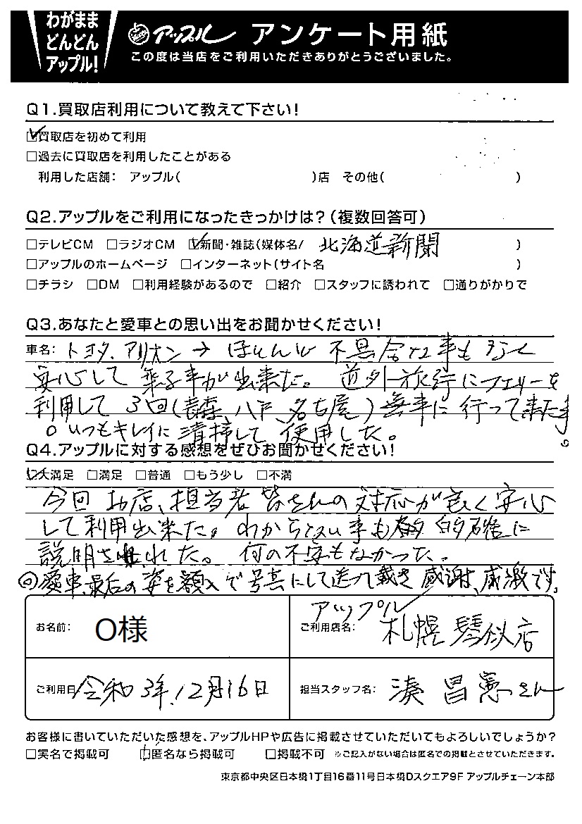 今回お店、担当者皆さんの対応が良く安心して利用出来た。わからない事も的確に説明された。何の不安もなかった。愛車最高の姿を額入で写真にして送って戴き感謝、感激です。