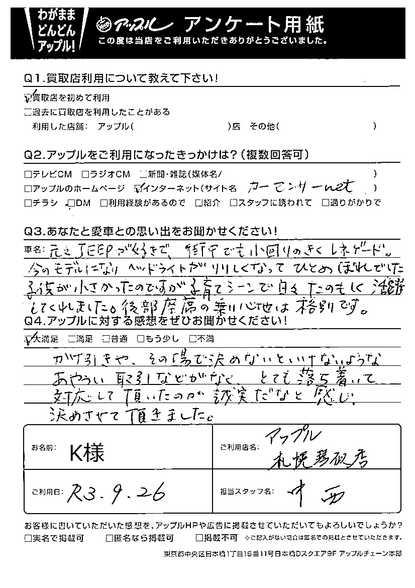 かけ引きや、その場で決めないといけないようなあやうい取引などがなく、とても落ち着いて対応して頂いたのが誠実な感じ。決めさせて頂きました。