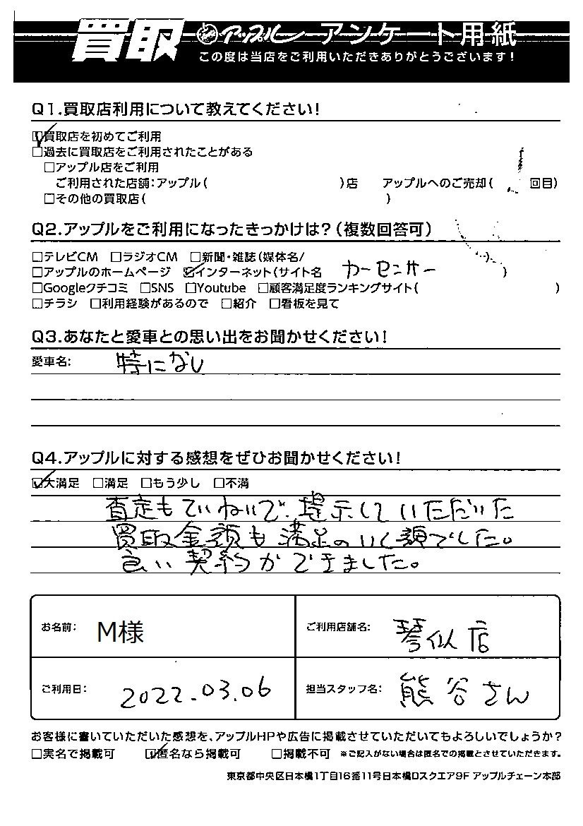 お車のご相談・ 査定だけでもOK! カンタン 入力 30秒 アップルがブランド買取始めました! お電話でも受付中! 受付時間10:00 ~ 18:00 0120-002-077 お車のご相談・ 査定だけでもOK! カンタン 入力 30秒 アップルがブランド買取始めました! お電話でも受付中! 受付時間10:00 ~ 18:00 0120-002-077 アップルがブランド買取始めました! お電話でも受付中! 受付時間10:00 ~ 18:00 0120-002-077 店舗情報 在庫車 スタッフ紹介 ブログ お客様の声 キャンペーン お得 無料査定 click お客様の声 ご記入日: 2022/03/06 M様 車名:ホンダ N-WGN Q:アップルに対する感想をぜひお聞かせください!大満足査定もていねいで、提示していただいた買取価格も満足のいく額でした。良い契約ができました。担当:アップル札幌琴似店 熊谷 前へ 次へ お客様の声一覧を見る