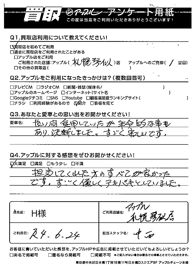 お車のご相談・ 査定だけでもOK! カンタン 入力 30秒 アップルがブランド買取始めました! お電話でも受付中! 受付時間10:00 ~ 18:00 0120-002-077 お車のご相談・ 査定だけでもOK! カンタン 入力 30秒 アップルがブランド買取始めました! お電話でも受付中! 受付時間10:00 ~ 18:00 0120-002-077 アップルがブランド買取始めました! お電話でも受付中! 受付時間10:00 ~ 18:00 0120-002-077 店舗情報 在庫車 スタッフ紹介 ブログ お客様の声 キャンペーン お得 無料査定 click お客様の声 ご記入日: 2022/06/24 H様 Q あなたと愛車との思い出をお聞かせください!長い間愛用していたが致命的な事もあり、決断しました。すごく寂しいです。Q アップルに対する感想をぜひお聞かせください!感想:大満足担当してくれた方のすべてが良かったです。すごく優しくテキパキとしていました。 前へ 次へ お客様の声一覧を見る