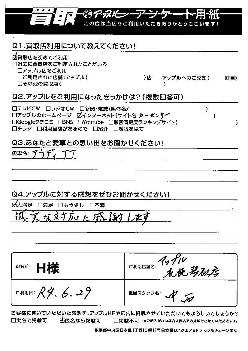 お車のご相談・ 査定だけでもOK! カンタン 入力 30秒 アップルがブランド買取始めました! お電話でも受付中! 受付時間10:00 ~ 18:00 0120-002-077 お車のご相談・ 査定だけでもOK! カンタン 入力 30秒 アップルがブランド買取始めました! お電話でも受付中! 受付時間10:00 ~ 18:00 0120-002-077 アップルがブランド買取始めました! お電話でも受付中! 受付時間10:00 ~ 18:00 0120-002-077 店舗情報 在庫車 スタッフ紹介 ブログ お客様の声 キャンペーン お得 無料査定 click お客様の声 ご記入日: 2022/06/29 H様 車名:アウディ TT Q アップルに対する感想をぜひお聞かせください!感想:大満足誠実な対応に感謝します。 前へ 次へ お客様の声一覧を見る