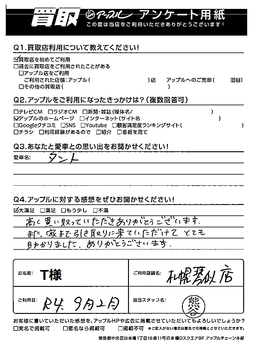 お車のご相談・ 査定だけでもOK! カンタン 入力 30秒 アップルがブランド買取始めました! お電話でも受付中! 受付時間10:00 ~ 18:00 0120-002-077 お車のご相談・ 査定だけでもOK! カンタン 入力 30秒 アップルがブランド買取始めました! お電話でも受付中! 受付時間10:00 ~ 18:00 0120-002-077 アップルがブランド買取始めました! お電話でも受付中! 受付時間10:00 ~ 18:00 0120-002-077 店舗情報 在庫車 スタッフ紹介 ブログ お客様の声 キャンペーン お得 無料査定 click お客様の声 ご記入日: 2022/09/02 T様 車名:ダイハツ タント Q アップルに対する感想をぜひお聞かせください!感想:大満足高く買い取っていただきありがとうございます。また、家まで引き取りにきていただけてとても助かりました。ありがとうございます。 前へ 次へ お客様の声一覧を見る