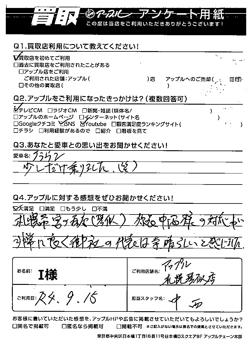 お車のご相談・ 査定だけでもOK! カンタン 入力 30秒 アップルがブランド買取始めました! お電話でも受付中! 受付時間10:00 ~ 18:00 0120-002-077 お車のご相談・ 査定だけでもOK! カンタン 入力 30秒 アップルがブランド買取始めました! お電話でも受付中! 受付時間10:00 ~ 18:00 0120-002-077 アップルがブランド買取始めました! お電話でも受付中! 受付時間10:00 ~ 18:00 0120-002-077 店舗情報 在庫車 スタッフ紹介 ブログ お客様の声 キャンペーン お得 無料査定 click お客様の声 ご記入日: 2022/09/15 I様 車名:トヨタ クラウンアスリート (H11年9月~H30年6月) Q:あなたと愛車との思い出をぜひお聞かせください!愛車名:クラウン少しだけ乗りました(笑)Q:アップルに対する感想をぜひお聞かせください!大満足札幌市宮の森(琴似) 係長 中西様の対応が非常に良く御社の代表は素晴らしいと感じました。 前へ 次へ お客様の声一覧を見る