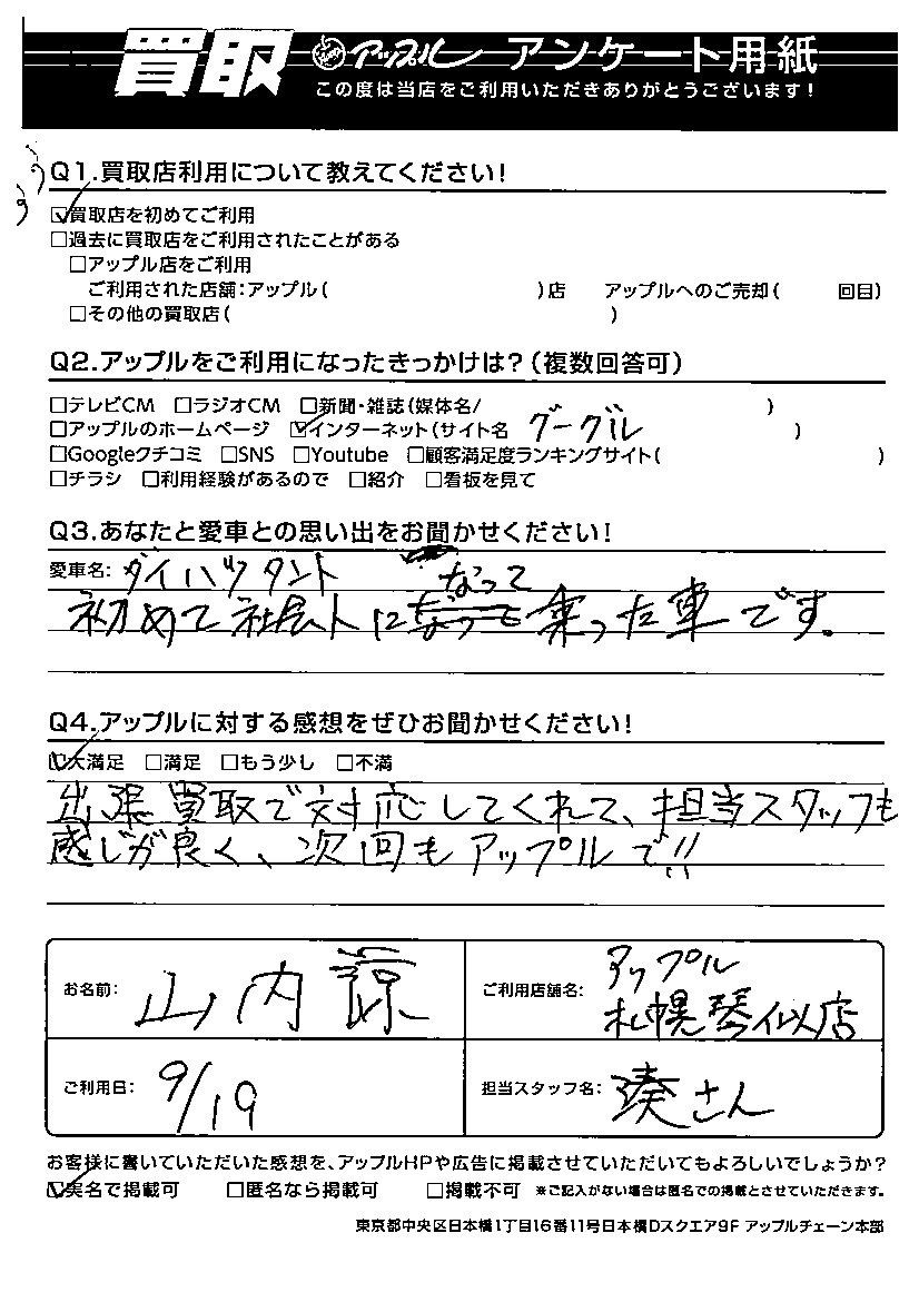 お車のご相談・ 査定だけでもOK! カンタン 入力 30秒 アップルがブランド買取始めました! お電話でも受付中! 受付時間10:00 ~ 18:00 0120-002-077 お車のご相談・ 査定だけでもOK! カンタン 入力 30秒 アップルがブランド買取始めました! お電話でも受付中! 受付時間10:00 ~ 18:00 0120-002-077 アップルがブランド買取始めました! お電話でも受付中! 受付時間10:00 ~ 18:00 0120-002-077 店舗情報 在庫車 スタッフ紹介 ブログ お客様の声 キャンペーン お得 無料査定 click お客様の声 ご記入日: 2022/09/19 山内諒様 車名:ダイハツ タント Q:あなたと愛車との思い出をぜひお聞かせください!愛車名:ダイハツ タント初めて社会人になって乗った車です。Q:アップルに対する感想をぜひお聞かせください!大満足出張買取で対応してくれて、担当スタッフも感じが良く、次回もアップルで!! 前へ 次へ お客様の声一覧を見る