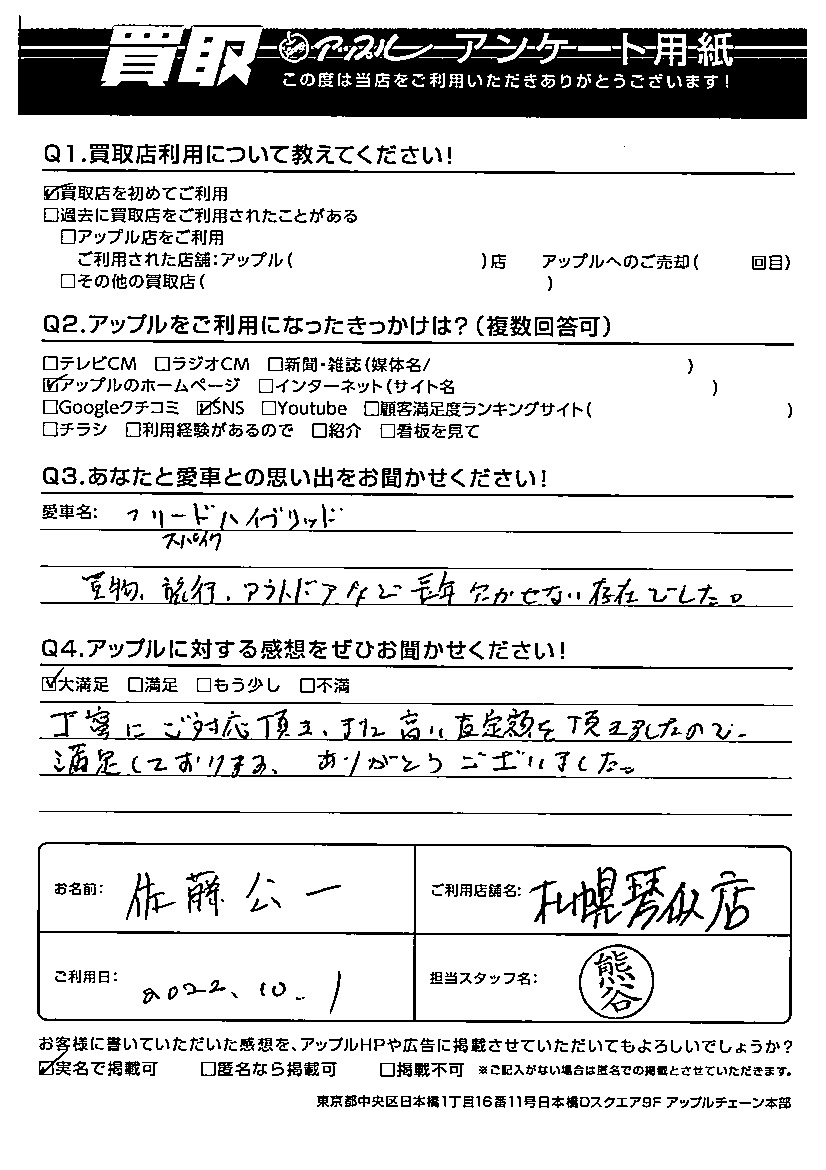 佐藤公一様 車名:ホンダ フリードスパイクハイブリッド