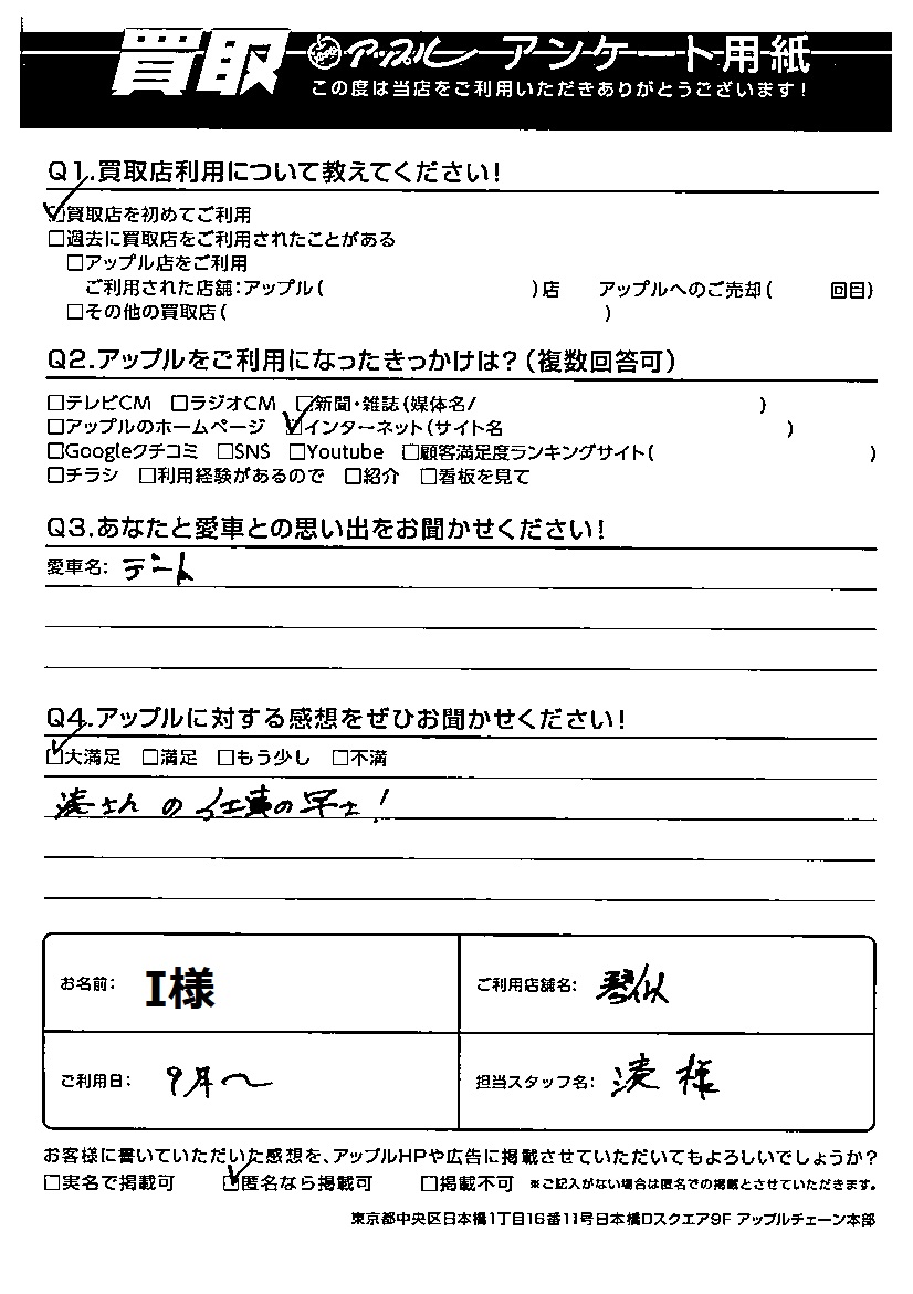 お車のご相談・ 査定だけでもOK! カンタン 入力 30秒 アップルがブランド買取始めました! お電話でも受付中! 受付時間10:00 ~ 18:00 0120-002-077 お車のご相談・ 査定だけでもOK! カンタン 入力 30秒 アップルがブランド買取始めました! お電話でも受付中! 受付時間10:00 ~ 18:00 0120-002-077 アップルがブランド買取始めました! お電話でも受付中! 受付時間10:00 ~ 18:00 0120-002-077 店舗情報 在庫車 スタッフ紹介 ブログ お客様の声 キャンペーン お得 無料査定 click お客様の声 ご記入日: 2022/09/01 I様 Q:アップルに対する感想をぜひお聞かせください!大満足湊さんの仕事の早さ! 前へ 次へ お客様の声一覧を見る