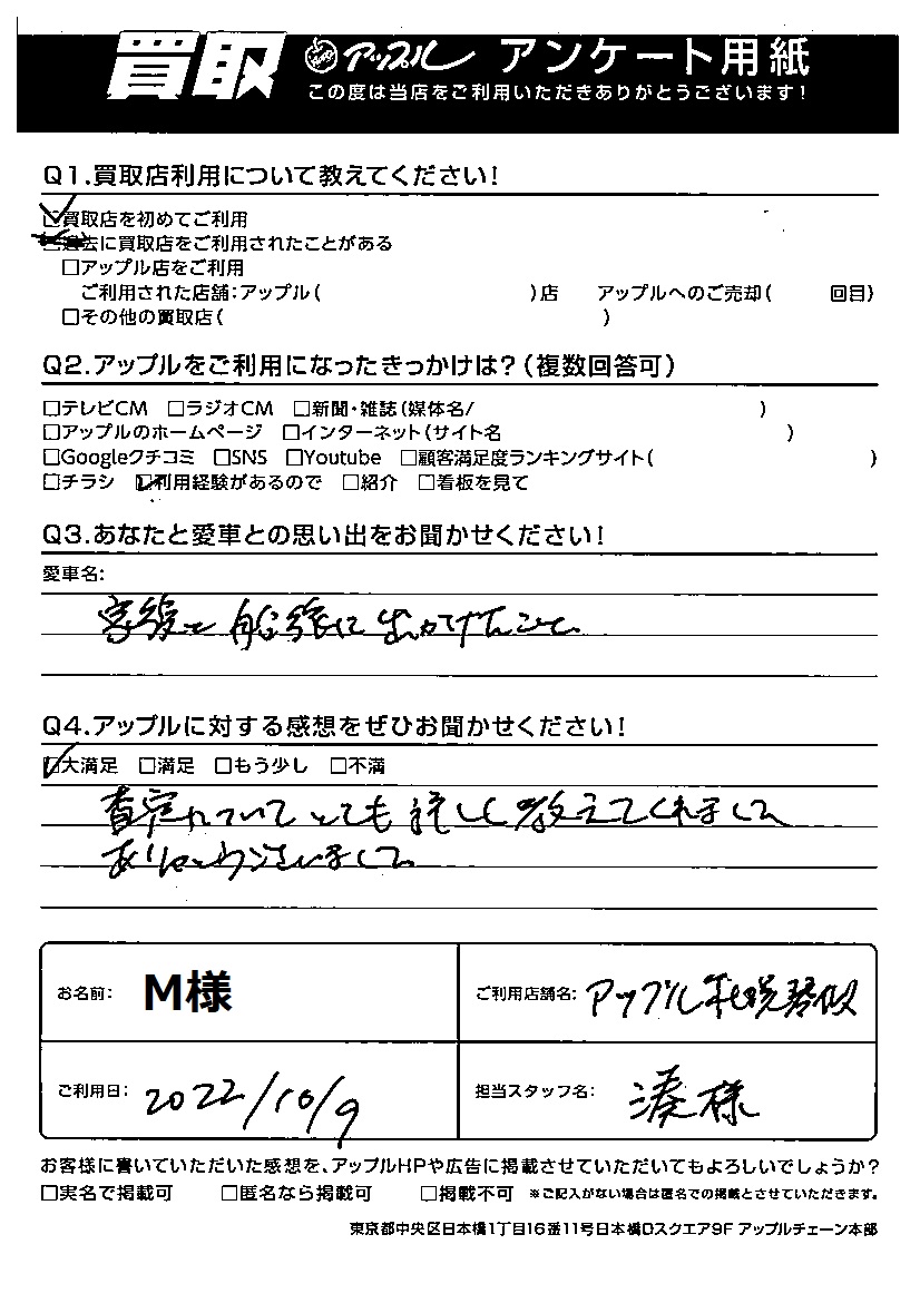 お車のご相談・ 査定だけでもOK! カンタン 入力 30秒 アップルがブランド買取始めました! お電話でも受付中! 受付時間10:00 ~ 18:00 0120-002-077 お車のご相談・ 査定だけでもOK! カンタン 入力 30秒 アップルがブランド買取始めました! お電話でも受付中! 受付時間10:00 ~ 18:00 0120-002-077 アップルがブランド買取始めました! お電話でも受付中! 受付時間10:00 ~ 18:00 0120-002-077 店舗情報 在庫車 スタッフ紹介 ブログ お客様の声 キャンペーン お得 無料査定 click お客様の声 ご記入日: 2022/10/09 M様 Q:あなたと愛車との思い出をぜひお聞かせください!家族と船旅に出かけたこと。Q:アップルに対する感想をぜひお聞かせください!大満足査定についてもとても詳しく教えてくれました。ありがとうございました。 前へ 次へ お客様の声一覧を見る