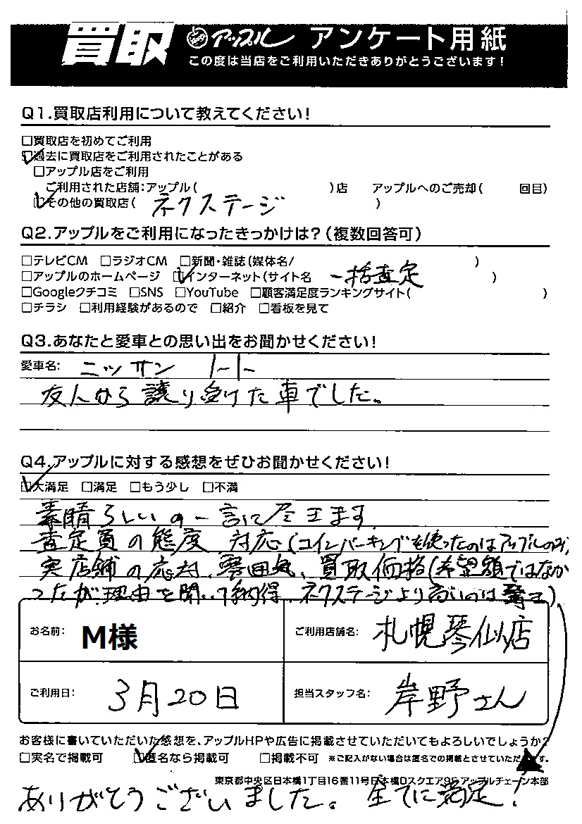 お車のご相談・ 査定だけでもOK! カンタン 入力 30秒 アップルがブランド買取始めました! お電話でも受付中! 受付時間10:00 ~ 18:00 0120-002-077 お車のご相談・ 査定だけでもOK! カンタン 入力 30秒 アップルがブランド買取始めました! お電話でも受付中! 受付時間10:00 ~ 18:00 0120-002-077 アップルがブランド買取始めました! お電話でも受付中! 受付時間10:00 ~ 18:00 0120-002-077 店舗情報 在庫車 スタッフ紹介 ブログ お客様の声 キャンペーン お得 無料査定 click お客様の声 ご記入日: 2023/03/20 M様 車名:日産 ノート Q:アップルに対する感想をぜひお聞かせください!大満足素晴らしいの一言に尽きます。査定員の態度、対応(コインパーキングを使ったのはアップルのみ)、実店舗の応対、雰囲気、買取価格(希望額ではなかったが理由を聞いて納得。ネクステージより高いのは驚き)、全てに満足。ありがとうございました。 前へ 次へ お客様の声一覧を見る