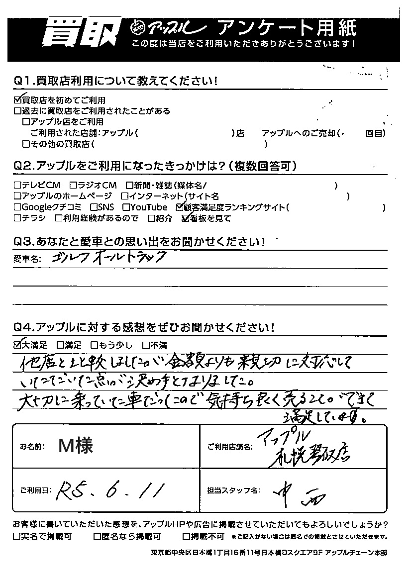 お車のご相談・ 査定だけでもOK! カンタン 入力 30秒 アップルがブランド買取始めました! お電話でも受付中! 受付時間10:00 ~ 18:00 0120-002-077 お車のご相談・ 査定だけでもOK! カンタン 入力 30秒 アップルがブランド買取始めました! お電話でも受付中! 受付時間10:00 ~ 18:00 0120-002-077 アップルがブランド買取始めました! お電話でも受付中! 受付時間10:00 ~ 18:00 0120-002-077 店舗情報 在庫車 スタッフ紹介 ブログ お客様の声 キャンペーン お得 無料査定 click お客様の声 ご記入日: 2023/06/11 M様 車名:フォルクスワーゲン ゴルフオールトラック Q:アップルに対する感想をぜひお聞かせください!大満足他店と比較しましたが金額よりも親切に対応していただいた点が決め手となりました。大切に乗っていた車だったので気持ち良く売ることができて満足しています。 前へ 次へ お客様の声一覧を見る
