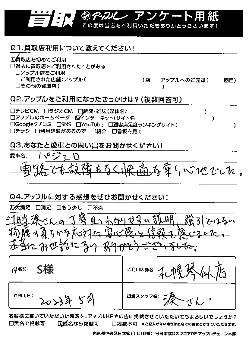 お車のご相談・ 査定だけでもOK! カンタン 入力 30秒 アップルがブランド買取始めました! お電話でも受付中! 受付時間10:00 ~ 18:00 0120-002-077 お車のご相談・ 査定だけでもOK! カンタン 入力 30秒 アップルがブランド買取始めました! お電話でも受付中! 受付時間10:00 ~ 18:00 0120-002-077 アップルがブランド買取始めました! お電話でも受付中! 受付時間10:00 ~ 18:00 0120-002-077 店舗情報 在庫車 スタッフ紹介 ブログ お客様の声 キャンペーン お得 無料査定 click お客様の声 ご記入日: 2023/05/01 S様 車名:三菱 パジェロ Q:アップルに対する感想をぜひお聞かせください!大満足ご担当 湊さんの丁寧且つわかりやすい説明、強引ではない物腰の柔らかな応対に安心感と信頼を感じました。本当にお世話になりありがとうございました。 前へ 次へ お客様の声一覧を見る
