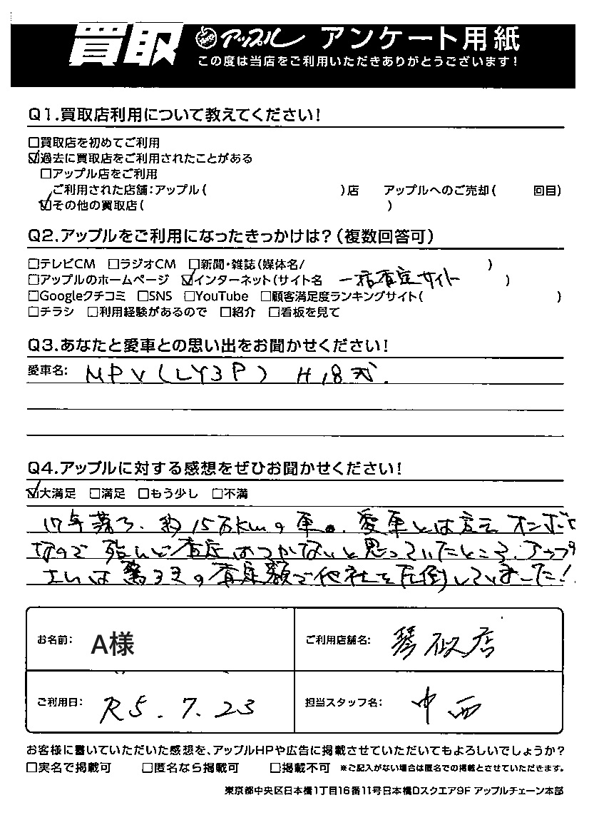 お車のご相談・ 査定だけでもOK! カンタン 入力 30秒 アップルがブランド買取始めました! お電話でも受付中! 受付時間10:00 ~ 18:00 0120-002-077 お車のご相談・ 査定だけでもOK! カンタン 入力 30秒 アップルがブランド買取始めました! お電話でも受付中! 受付時間10:00 ~ 18:00 0120-002-077 アップルがブランド買取始めました! お電話でも受付中! 受付時間10:00 ~ 18:00 0120-002-077 店舗情報 在庫車 スタッフ紹介 ブログ お客様の声 キャンペーン お得 無料査定 click お客様の声 ご記入日: 2023/07/23 A様 車名:マツダ MPV Q:アップルに対する感想をぜひお聞かせください!大満足17年落ち、約15万㎞の車。愛車とは言え、オンボロなので殆ど査定はつかないと思っていたところ、アップルさんは驚きの査定額で他社を圧倒していました! 前へ 次へ お客様の声一覧を見る