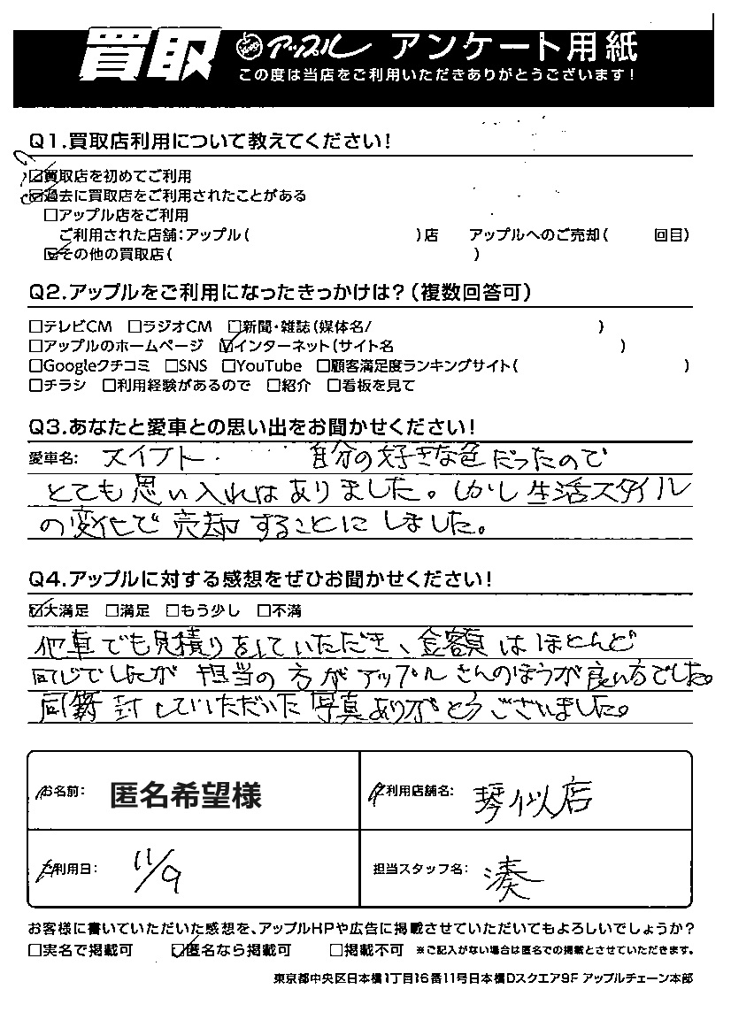 他社でも見積りをしていただき、金額はほとんど同じでしたが担当の方がアップルさんのほうが良い方でした。同封していただいた写真ありがとうございました。
