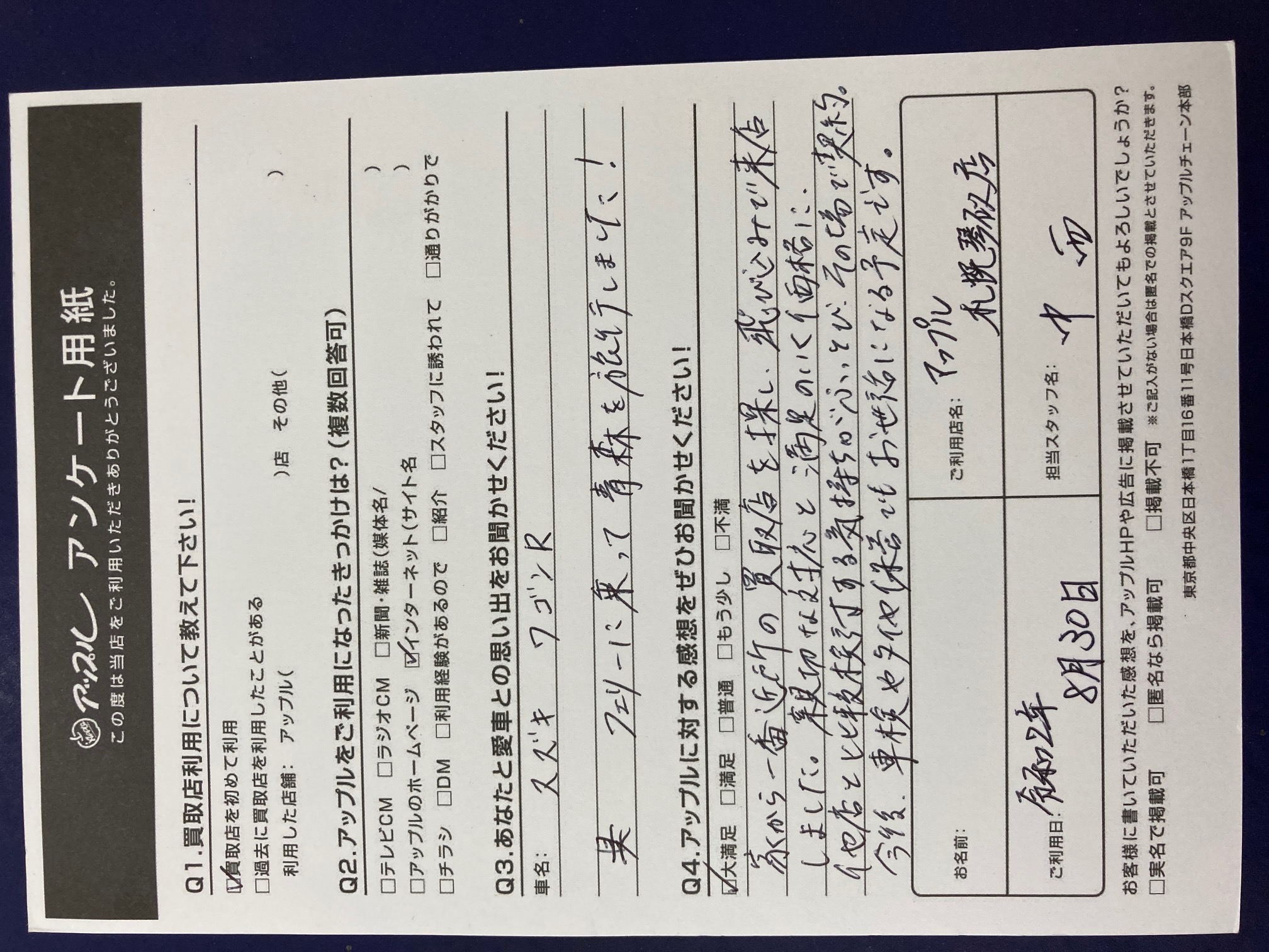 家から一番近所の買取店を探し、飛び込みで来店しました。親切な対応と満足のいく価格に他社と比較検討する気持ちがふっとびその場で契約。今後、車検やタイヤ保管でもお世話になる予定です。