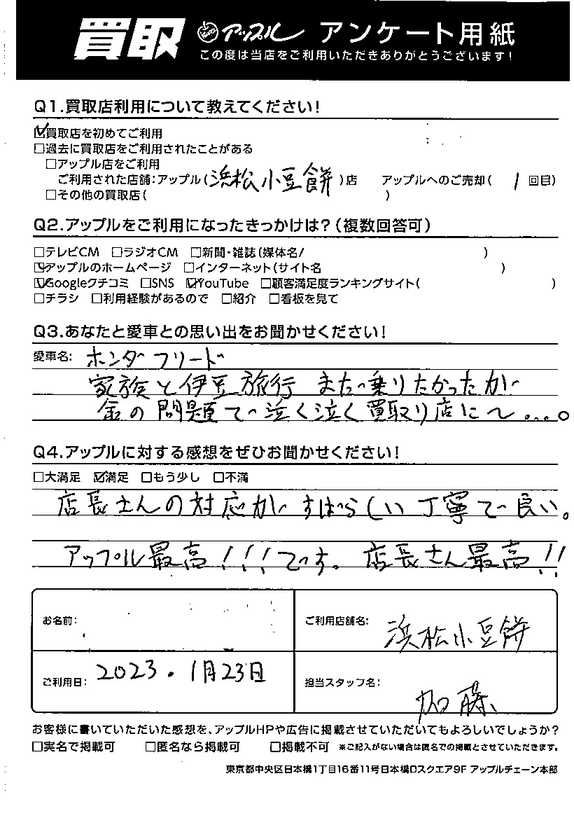 浜松市 K.Y様 車名:ホンダ フリード(H28年9月以降のハイブリッド含む)