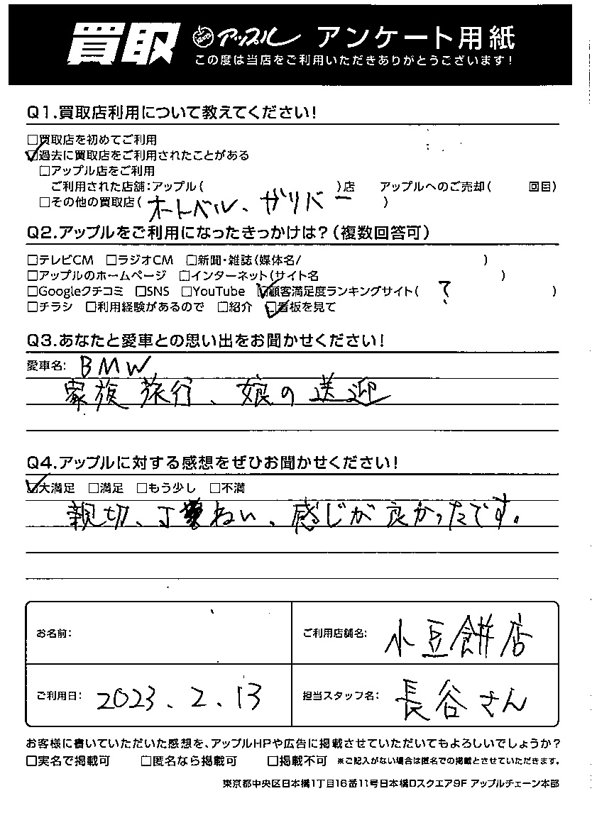 お車のご相談・ 査定だけでもOK! カンタン 入力 30秒 アップルがブランド買取始めました! お電話でも受付中! 受付時間10:00 ~ 18:30 053-437-7711 お車のご相談・ 査定だけでもOK! カンタン 入力 30秒 アップルがブランド買取始めました! お電話でも受付中! 受付時間10:00 ~ 18:30 053-437-7711 アップルがブランド買取始めました! お電話でも受付中! 受付時間10:00 ~ 18:30 053-437-7711 店舗情報 在庫車 スタッフ紹介 ブログ お客様の声 キャンペーン 無料査定 click お客様の声 ご記入日: 2023/02/13 浜松市 T.S様 車名:BMW X1 Q:あなたと愛車の思い出をお聞かせください。 家族旅行、娘の送迎Q:アップルに対する感想をぜひお聞かせください。 親切ていねい。感じが良かったです。 前へ 次へ お客様の声一覧を見る